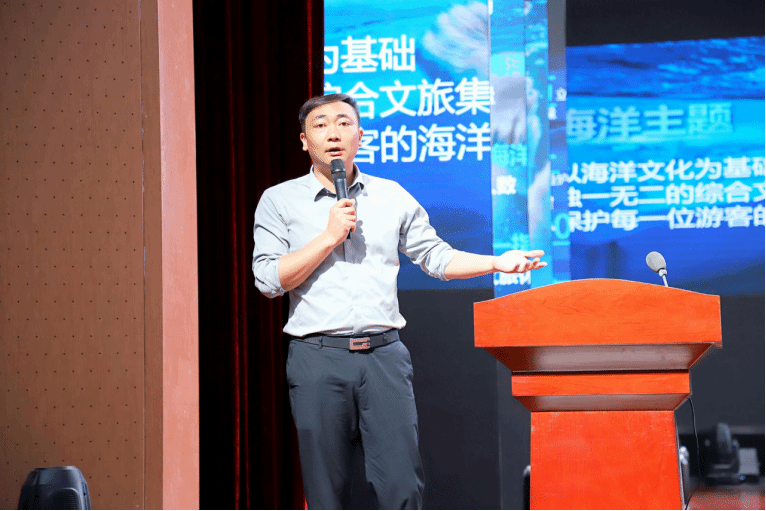 郑州海昌海洋公园销售总监梅广华介绍了郑州海昌海洋旅游度假区的特色产品,希望同学们能依托好的平台,迎接旅游行业的新未来。