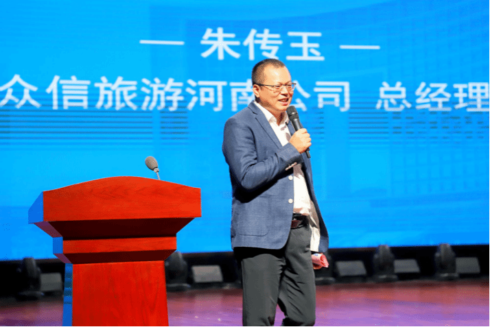 众信旅游河南公司总经理朱传玉通过展示众信旅游的业务内容,讲解了旅行社的发展现状和前景。
