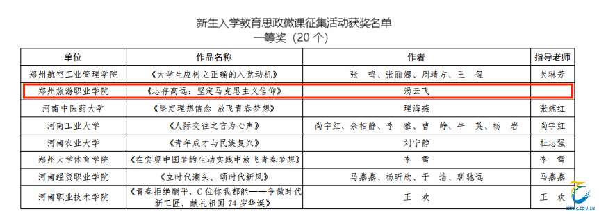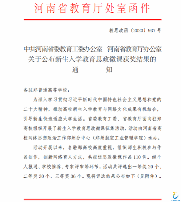 近日,中共河南省委教育工委办公室、河南省教育厅办公室联合下发《关于公布新生入学教育思政微课获奖结果的通知》(教思政函〔2023〕937号),公布了新生入学教育思政微课获奖结果,其中,海洋之神590登录入口报送作品《志存高远:坚定马克思主义信仰》荣获一等奖,《资助政策第一课》荣获二等奖,《安全教育》荣获三等奖。