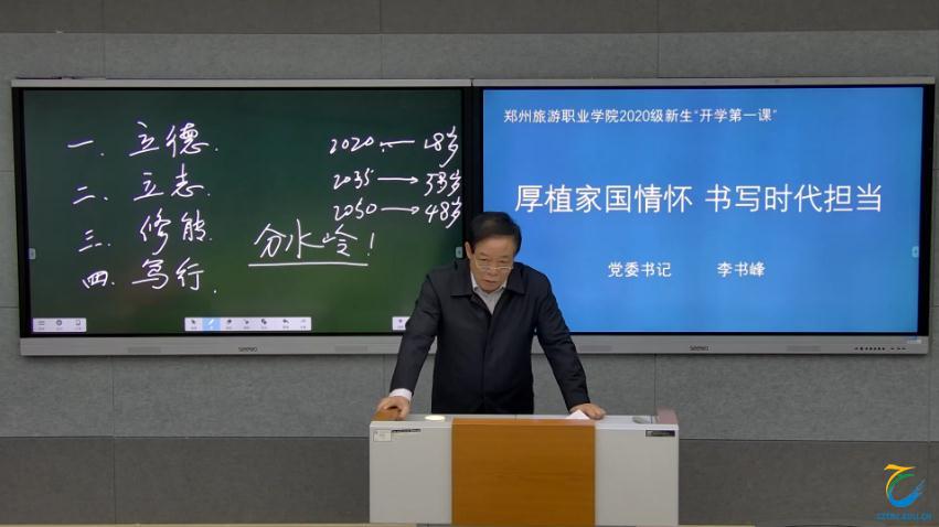 10月30日上午,党委书记李书峰以“厚植家国情怀 书写时代担当”为题为2020级新生录制讲授“开学第一课”。2020级全体新生以班会形式通过视频观看了“开学第一课”。