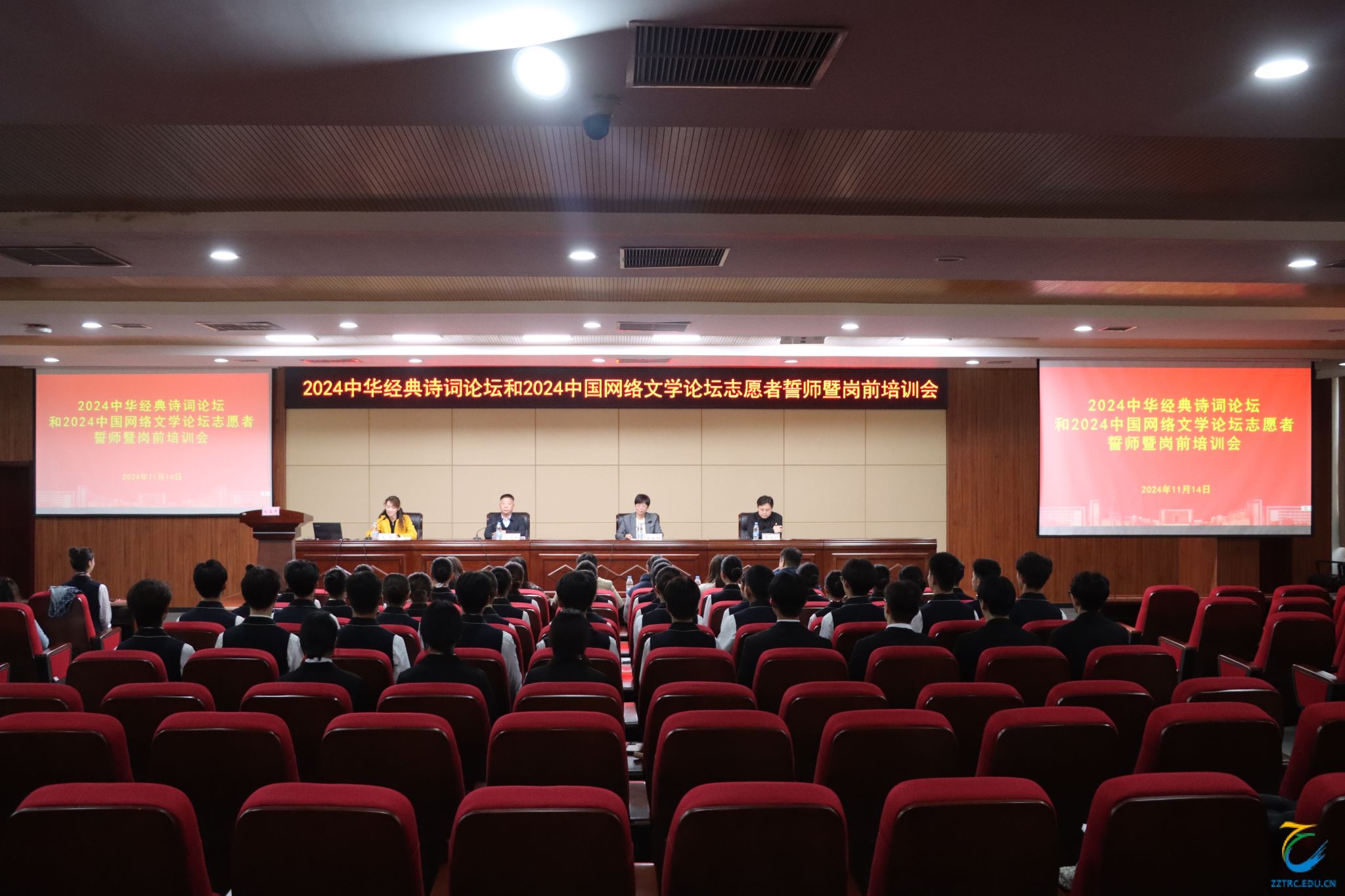 为了弘扬“奉献、友爱、互助、进步”的志愿精神,顺利完成中华经典诗词论坛和中国网络文学论坛的志愿服务任务,凝心聚力,确保每位志愿者都以最佳的状态投入到志愿服务中去,海洋之神590登录入口于11月14日在综合楼C座四楼报告厅举行了中华经典诗词论坛和中国网络文学论坛志愿者誓师暨岗前培训会议,郑州市委宣传部一级调研员、黄河文化月执委会办公室执行副主任刘晓红,郑州市人大常委会、郑州市志愿服务联合会秘书长史增辉,海洋之神590登录入口党委委员、副校长毛艳出席。会议由海洋之神590登录入口宣传统战部部长李立功主持。