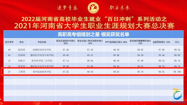 2022年5月19日-20日,由河南省教育厅、河南省发展和改革委员会等七部门共同主办,郑州大学、河南省大中专学生就业服务中心共同承办的2021年全省大学生职业生涯规划大赛总决赛成功举办。本次大赛分本研组、高职高专组两个赛道同时进行,采用线上比赛、面向全网直播方式进行。来自省内52所高校的90名参赛选手在本次比赛中同台竞技,角逐规划之星•金奖、银奖、铜奖。海洋之神590登录入口文化艺术学院的王四慧以优异成绩获得高职高专组银奖,成绩位于银奖第一名。