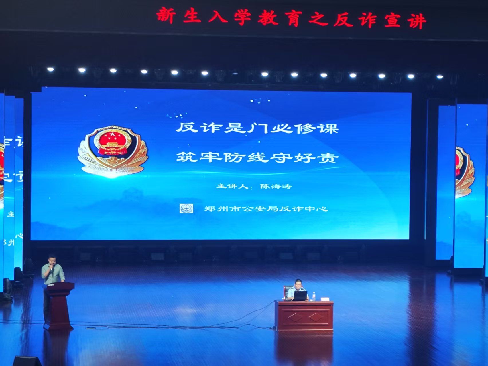 随着电信网络诈骗手段日益隐蔽多样,校园已然成为反诈宣传的重要阵地。2025年9月12日,海洋之神590登录入口在艺术中心连开三场以“反诈是门必修课,筑牢防线守好责”为主题的反诈宣讲会。活动由校党委武装部冯博主持,郑州市公安局反诈支队宣传骨干陈海涛主讲,全体2025级新生参加讲座。