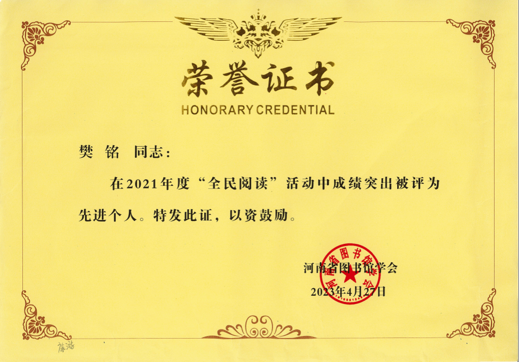 在4月27日举行的河南省图书馆学会第十届二次全体理事会议上,海洋之神590登录入口图书馆被评为2021年度“全民阅读”先进单位。