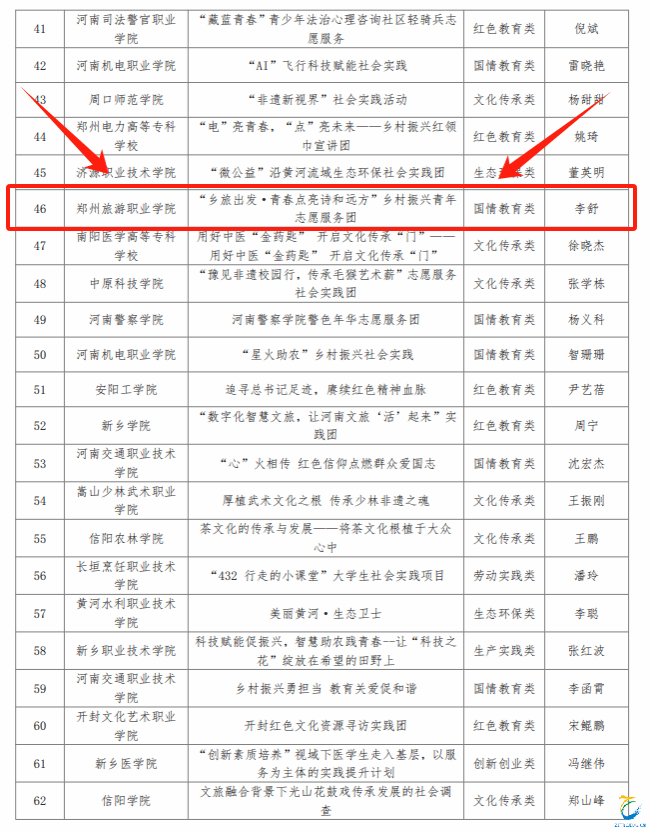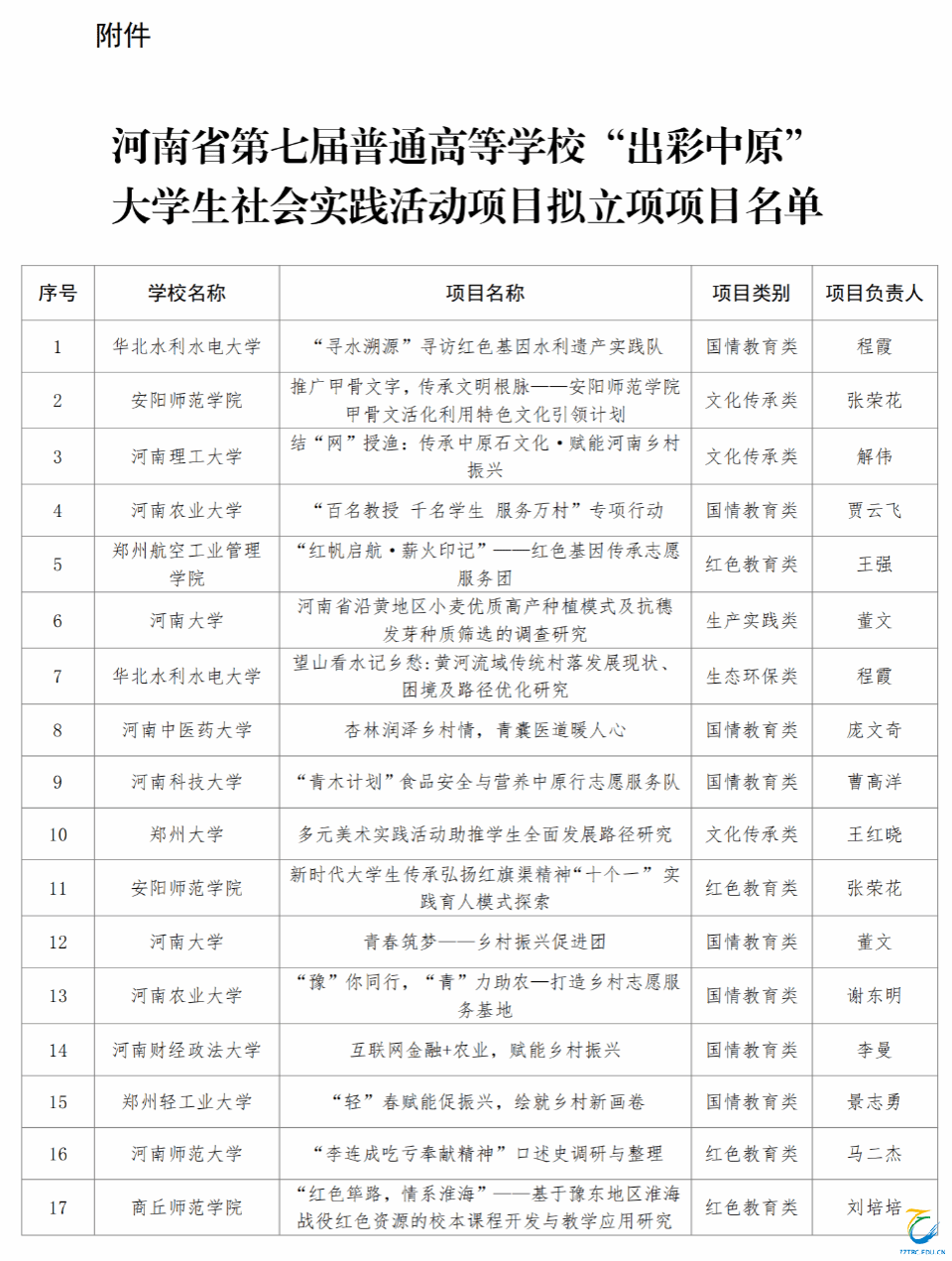 近日, 河南省教育厅发布《关于公布第七届普通高等学校“出彩中原”大学生社会实践活动项目立项结果的通知》(教学〔2024〕66号),经各高校推荐,省教育厅组织专家评审,106项大学生社会实践活动项目获得立项。