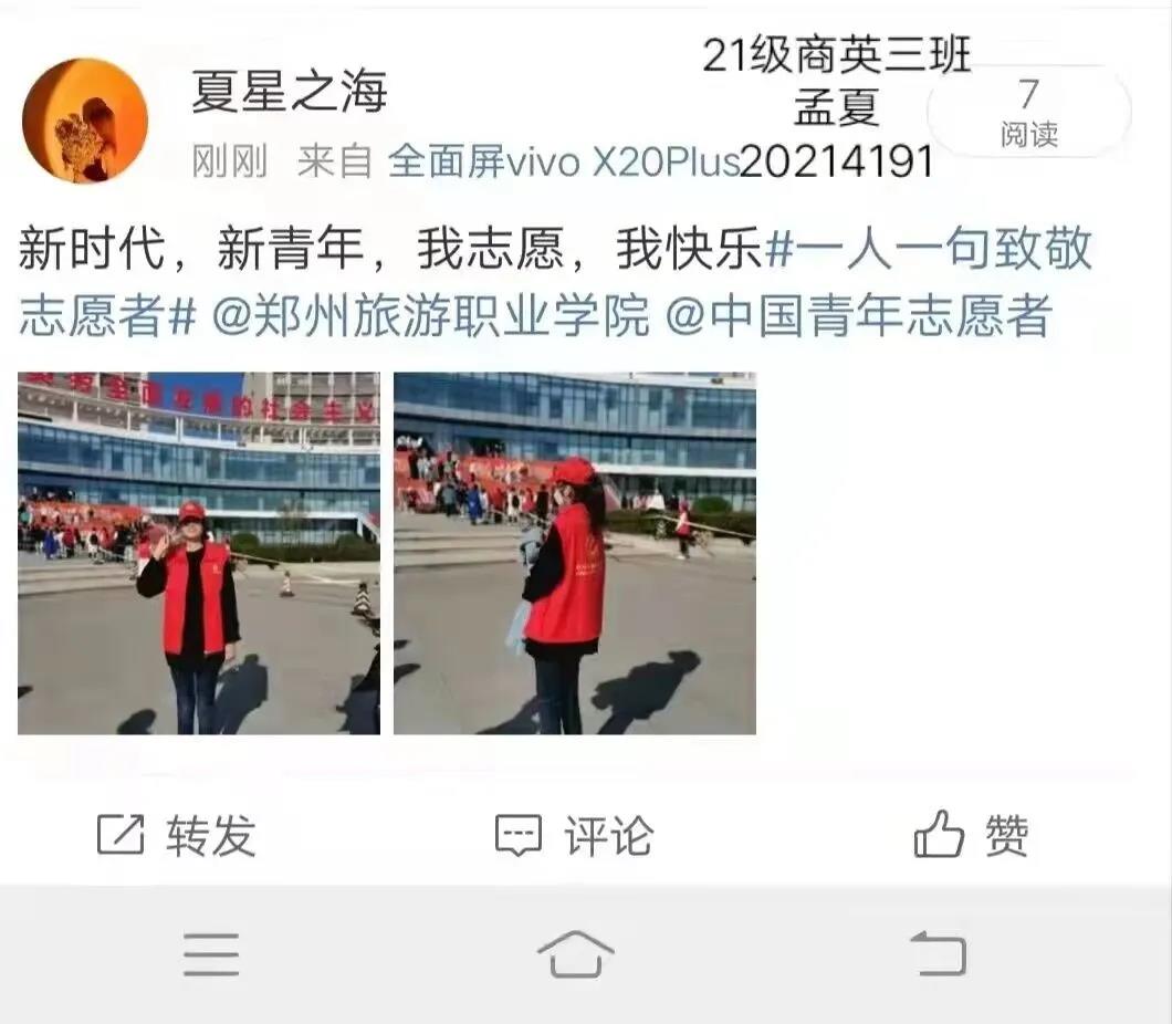 此次活动12月5日学生积极参与,热情高涨。同学们在微博上写下自己最真挚的话语赞美志愿者,致敬每一位志愿路上同行的伙伴,上传自己参加志愿活动的照片,展现志愿者风采,呼吁更多人加入志愿者的队伍中。
