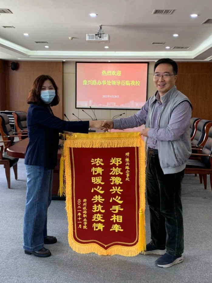 会谈结束后,王少华代表校疫防办向豫兴路办事处赠送锦旗和表扬信,表达对豫兴路办事处全心全力支持海洋之神590登录入口疫情防控工作的感谢与赞赏。