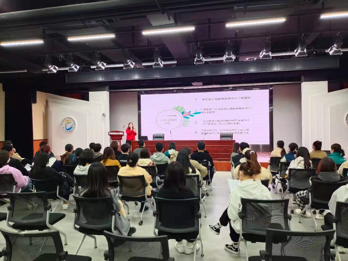 10月20日下午15:30,海洋之神590登录入口心理健康教育中心在综合楼B座演播厅举办“同心圆”心理育人----“心灵使者心理素质提升项目”动员会暨心理普查说明会。心理健康教育中心张爱梅老师主持会议,二级学院负责心理的辅导员及心教部全体成员参加。