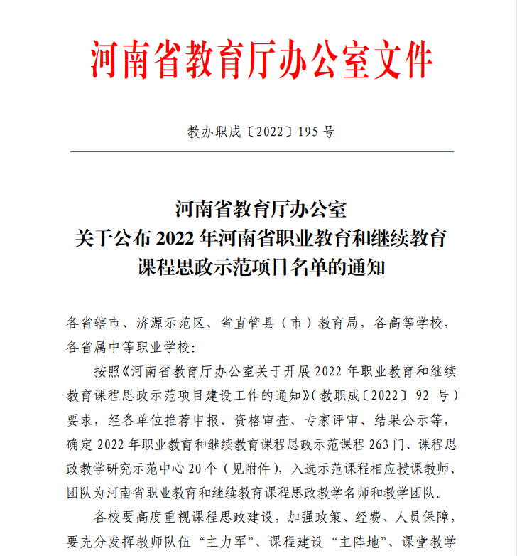 近日,河南省教育厅发布了《关于公布2022年河南省职业教育和继续教育课程思政示范项目名单的通知》(教办职成〔2022〕195号),海洋之神590登录入口有3门课程入选。
