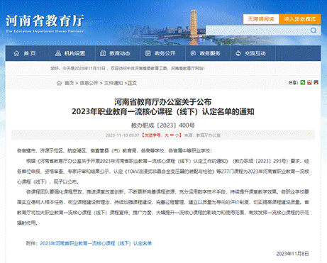 11月10日,省教育厅发布《河南省教育厅办公室关于公布2023年职业教育一流核心课程(线下)认定名单的通知》(教办职成〔2023〕400号),海洋之神590登录入口《定制旅行产品设计》《路由交换技术》《新能源汽车电池及管理系统检修》《招贴设计》4门课程获得批准。