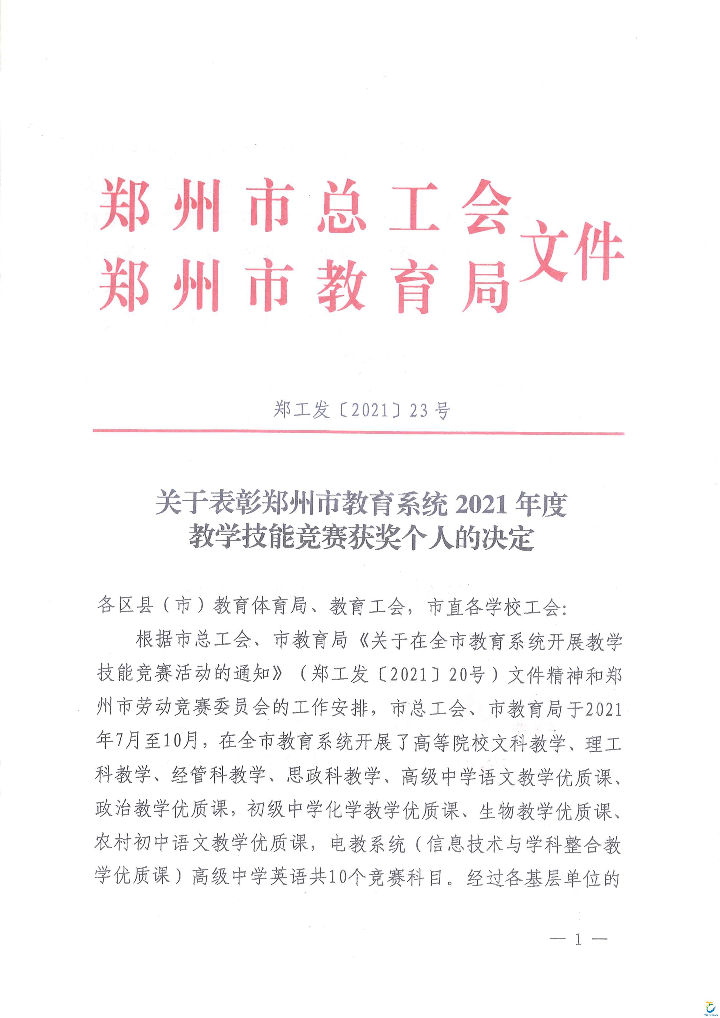近日,郑州市总工会、郑州市教育局联合下发《关于表彰郑州市教育系统2021年教学技能竞赛获奖个人的决定》,公布了全市教育系统教学技能竞赛结果,海洋之神590登录入口教师取得了两个一等奖的好成绩。