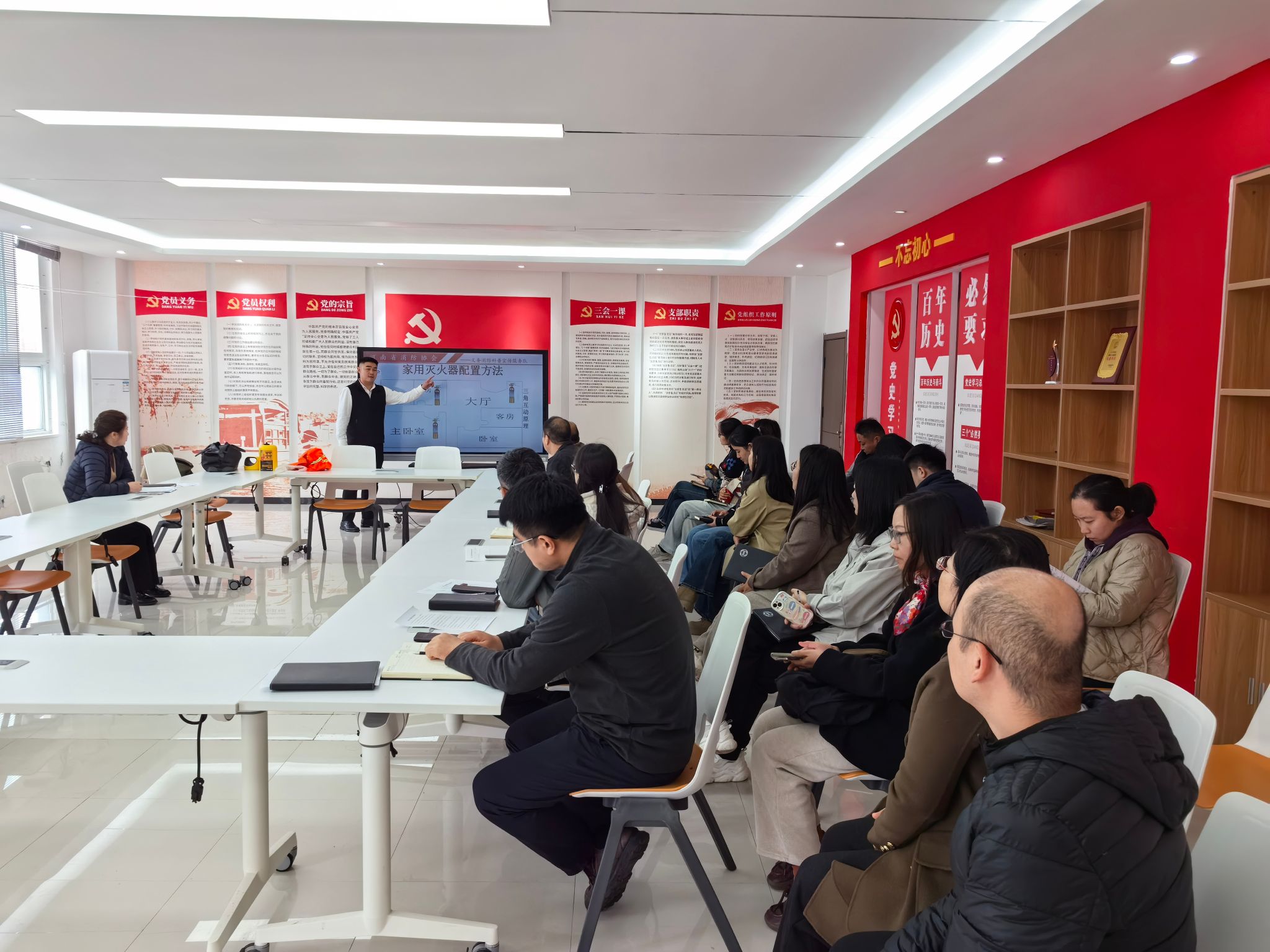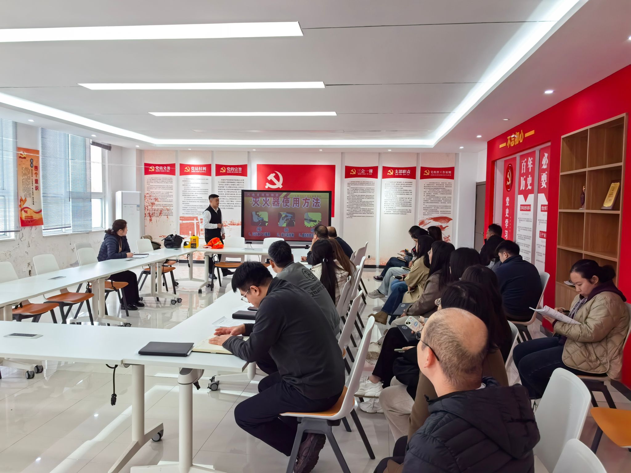张教员结合高校教学与生活场景,通过播放火灾事故视频、展示真实案例图片,生动剖析了办公区域用电不规范、实验室设备操作不当等常见火灾隐患。在理论讲解环节,张教员系统阐述了火灾预防的重要性,详细介绍了不同类型灭火器的适用场景及正确使用方法,还深入讲解了火场逃生的基本要领,以及如何选择正确的逃生路线、怎样利用专业设备等物品进行自我防护。