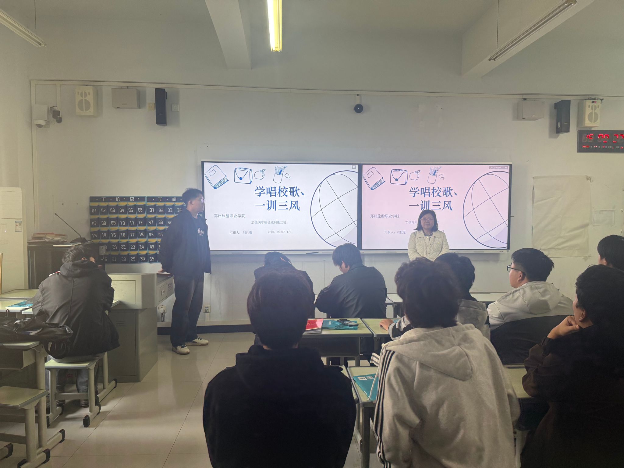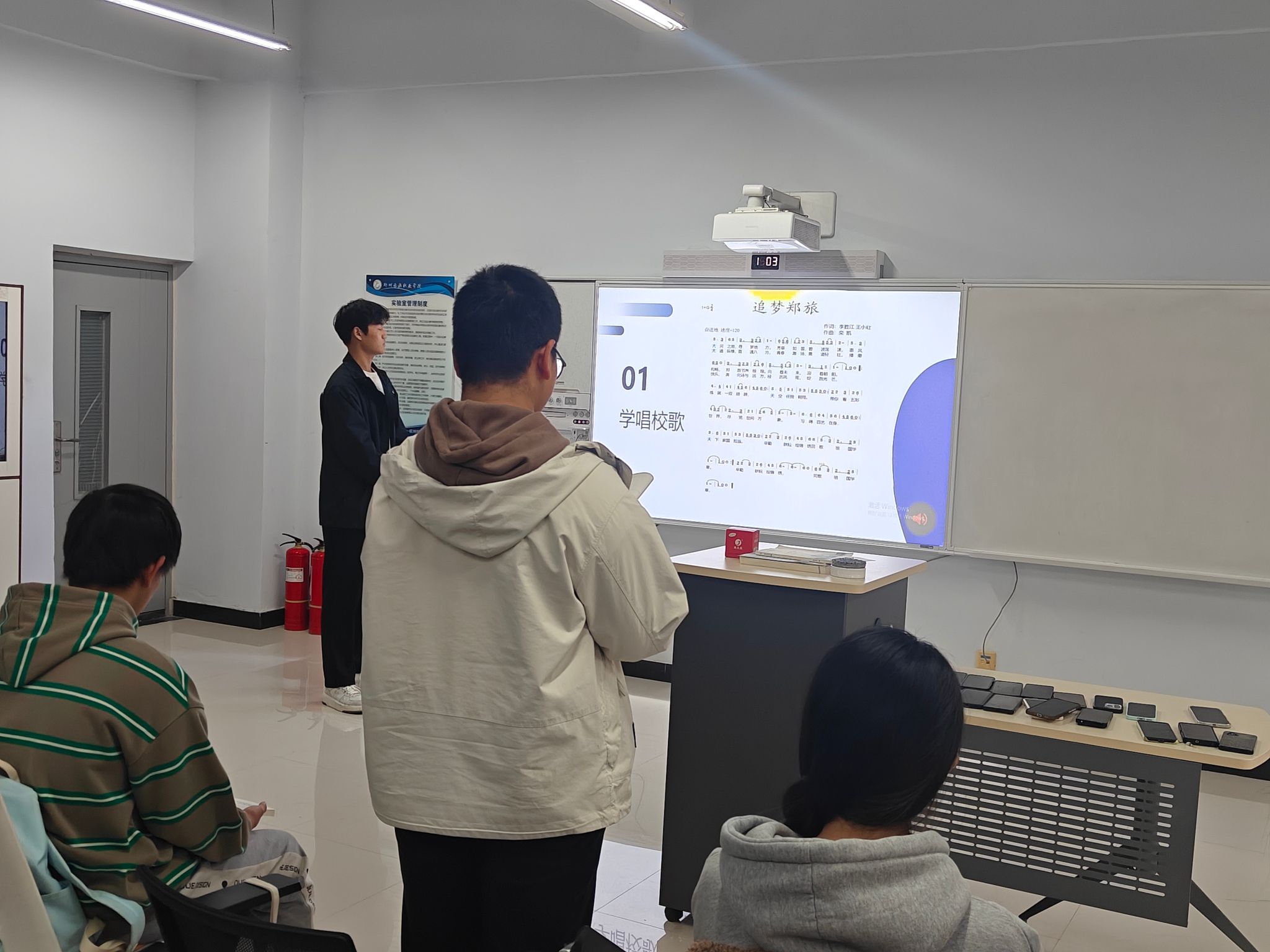 班会伊始,各班团支书带领同学们深入了解校歌的创作背景和歌词内涵,结合学校发展历程与办学成果,生动讲解校园文化积淀。学唱校歌环节,通过音频播放、逐句领唱及歌词解析,引导大家精准把握旋律,在悠扬的旋律中,同学们饱含深情地学唱校歌,歌声中传递着对学校的热爱与自豪。随后,围绕“一训三风”,即校训、校风、教风、学风,团支书结合学院实际进行了生动讲解。同学们深刻体会到“立德修能,知行合一”的校训精神,以及严谨求实、团结奋进的校风、教风和学风对个人成长的重要意义。