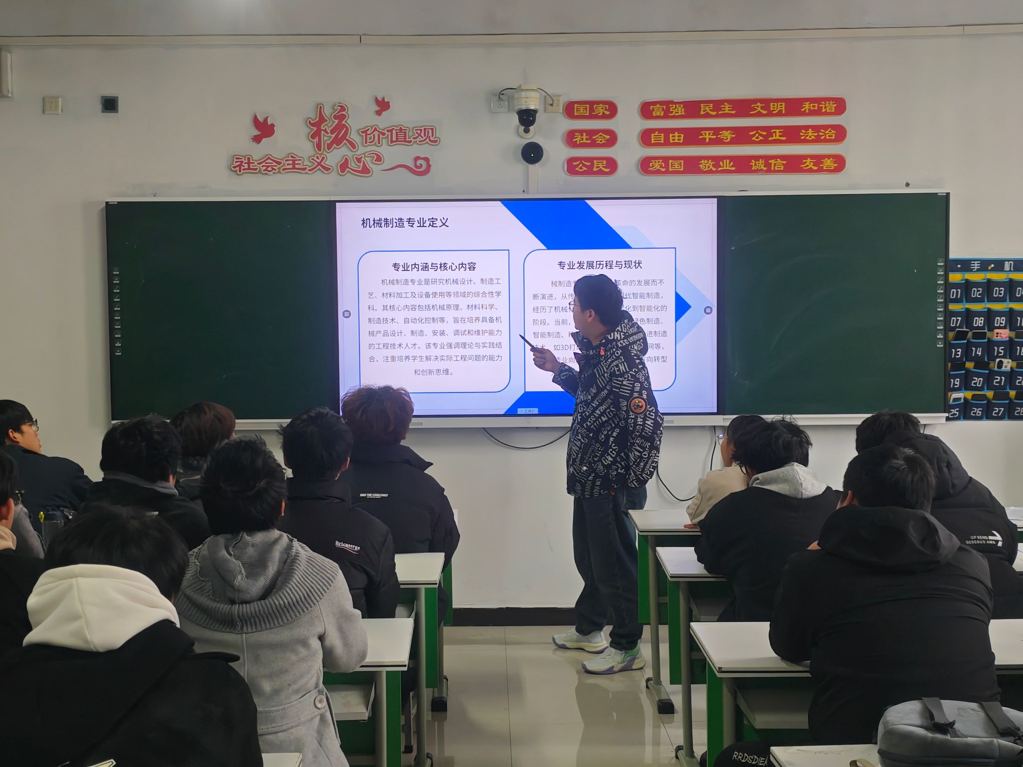 班会现场,团支书结合学院专业设置特点,以“专业是什么、学什么、能做什么”为核心展开讲解。从各专业的行业定位入手,梳理了专业核心课程与基础课程的衔接逻辑,同时结合当下智能行业发展趋势,介绍了不同专业对应的岗位方向,让新生们对所学专业的发展前景有了清晰认知。班主任则结合教学经验与行业见闻,针对新生关注的学习方法、技能提升等问题逐一回应。部分班主任还分享了往届学生的学习案例,建议新生根据专业特点夯实基础,主动参与学院组织的专业实训、技能竞赛等活动,提前积累实践经验。