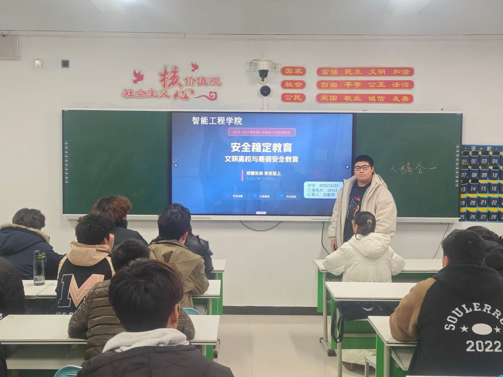 为切实筑牢校园安全防线,引导学生提升安全意识、践行文明准则,12月23日,智能工程学院组织各班开展“文明离校与寒假安全”主题班会,本次班会由各班团支书主持。