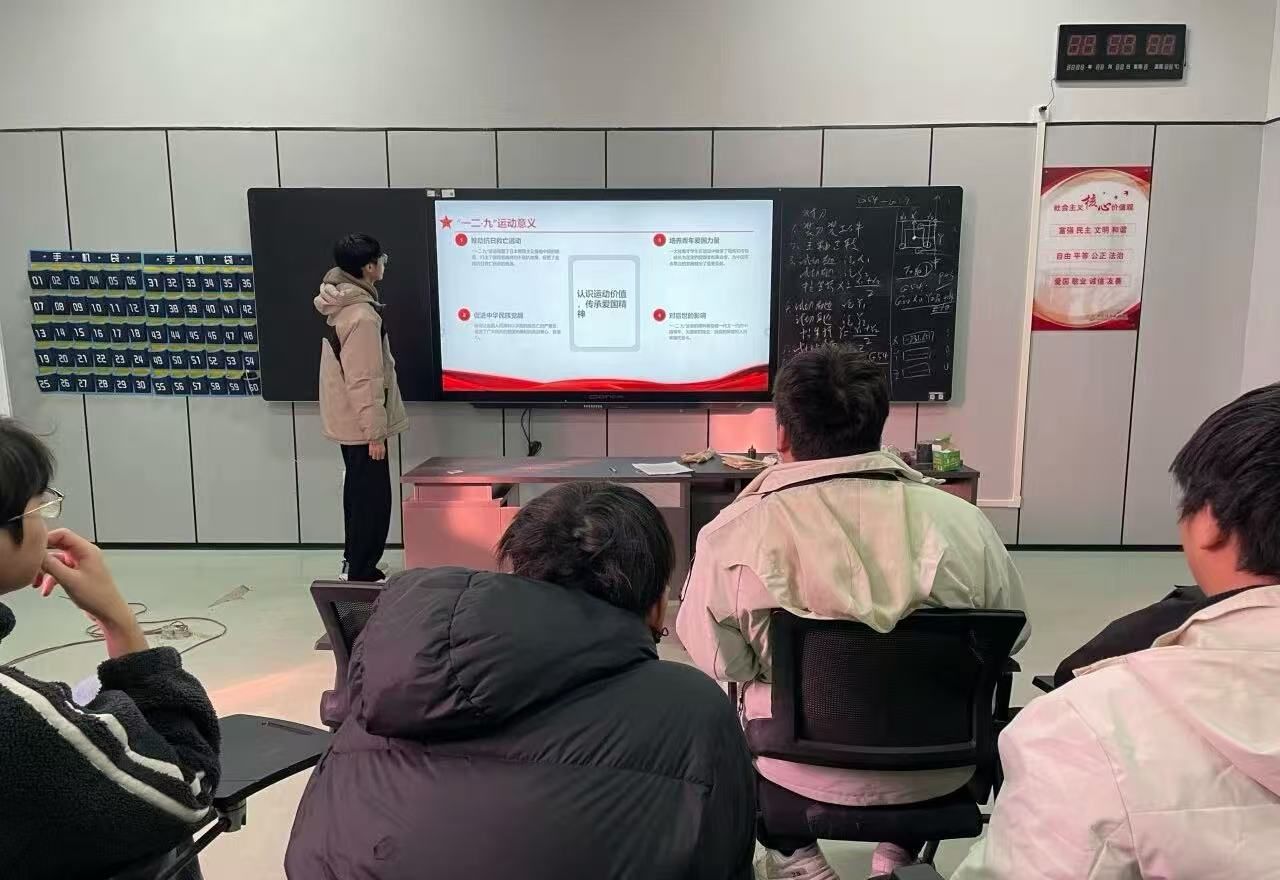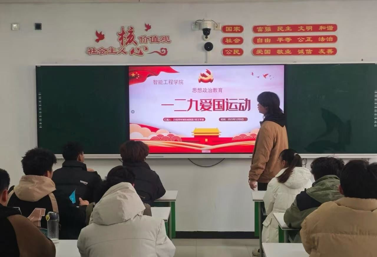班会期间,团支书通过历史影像、文字史料等形式,生动讲述“一二·九”运动的背景、经过与历史意义,带领同学们重温革命先辈为民族独立挺身而出的热血岁月。班主任结合新时代青年使命,引导学生将爱国情怀转化为学习动力,鼓励大家立足智能工程技术专业领域,练就过硬本领,以实际行动践行青春担当。现场互动环节中,同学们踊跃分享感悟,纷纷表示要铭记历史、砥砺前行。
