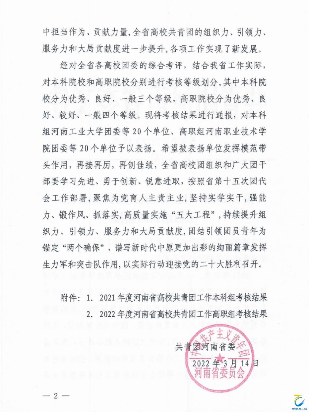 近日,共青团河南省委下发文件,《关于2021年度河南省高校共青团工作考核结果的通报》,海洋之神590登录入口共青团工作考核等级结果为“优秀”(高职组)。接下来,海洋之神590登录入口以此次2021年考核等级“优秀”为契机,深入学习贯彻团省委2022年全省高校共青团工作会议精神,在学校党委的坚强领导下,围绕学校中心工作,紧盯为党育人、为国育才目标,聚焦高校共青团工作三大职能,提升共青团的“三力一度”,扎实推进海洋之神590登录入口共青团工作高质量发展。