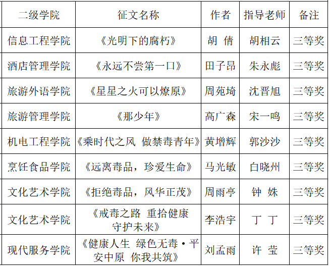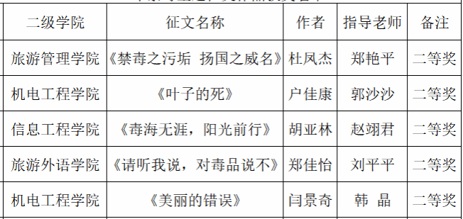 为进一步加大禁毒宣传力度,增强在校学生识毒防毒拒毒意识和能力,根据河南省教育厅、河南省禁毒委员会办公室《关于举办2023年全省大中小学生禁毒主题征文活动的通知》豫禁毒办通[2023]8号文件要求,学校在9月13号至10月10日组织开展了以“健康人生 绿色无毒·平安中原 你我共筑”为主题的征文活动。