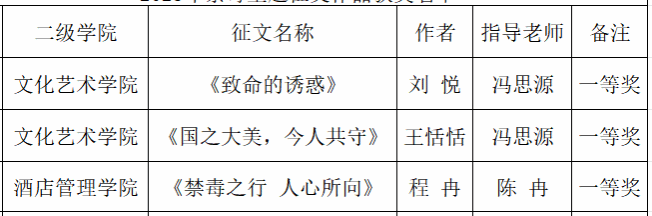 经安全保卫中心组织的评审组对征集的68份作品进行评审,最终评出一等奖3名、二等奖5名、三等奖9名、优秀指导老师7名。为保证大赛公平、公正,现将名单公示如下: