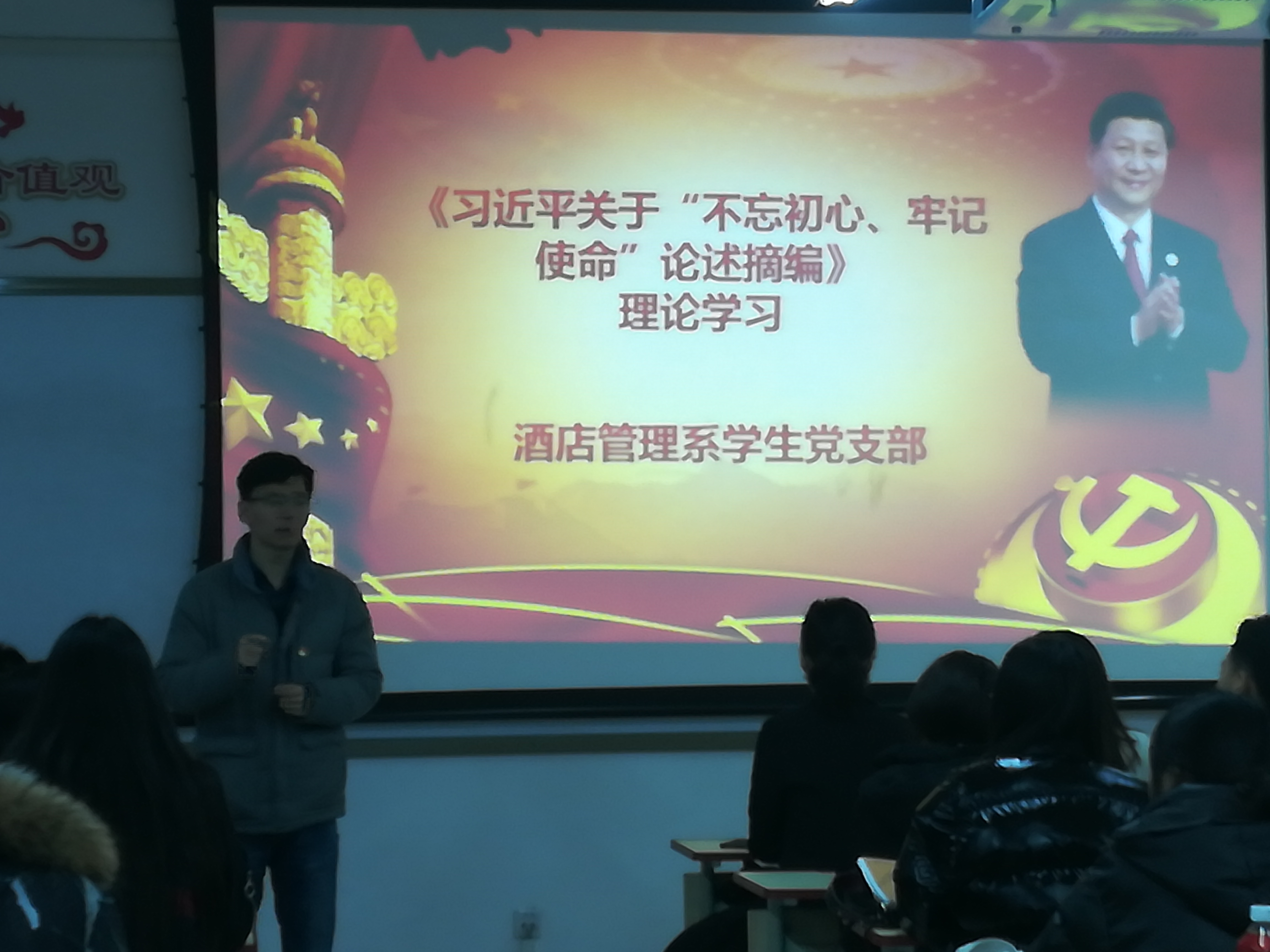 为提高学生党员理论修养,2019年12月25日,酒店管理学院学生党支部组织入党积极分子集中学习以《习近平关于“不忘初心、牢记使命”论述摘编》理论。会议由学生党支部书记牛亚飞老师主持。