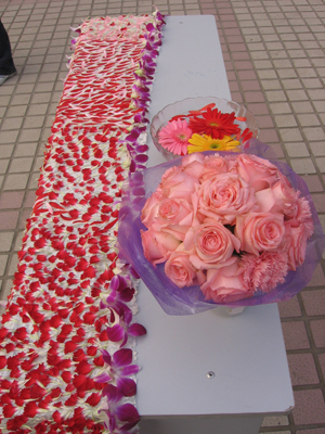 下午的展示由院礼仪队的三位学生为模特,头戴各种造型的丝网花头饰,身披由鲜花制作的美艳花毯,手持各式丝网花和造型美观的鲜花花束,分别展示了两类花艺。其中丝网花包括头花、项链、耳饰、胸花、盆花几大类,展示的有牡丹、玫瑰、梅花、团花、百合、太阳花、香雪兰、鸢尾花、黄蝴蝶等多个花型。随后的鲜花插花中又展示了直立型插花、悬垂型插花、心型插花、花球、花毯、花束、花篮等10余种,他们多由时令鲜花经过巧妙搭配而成。