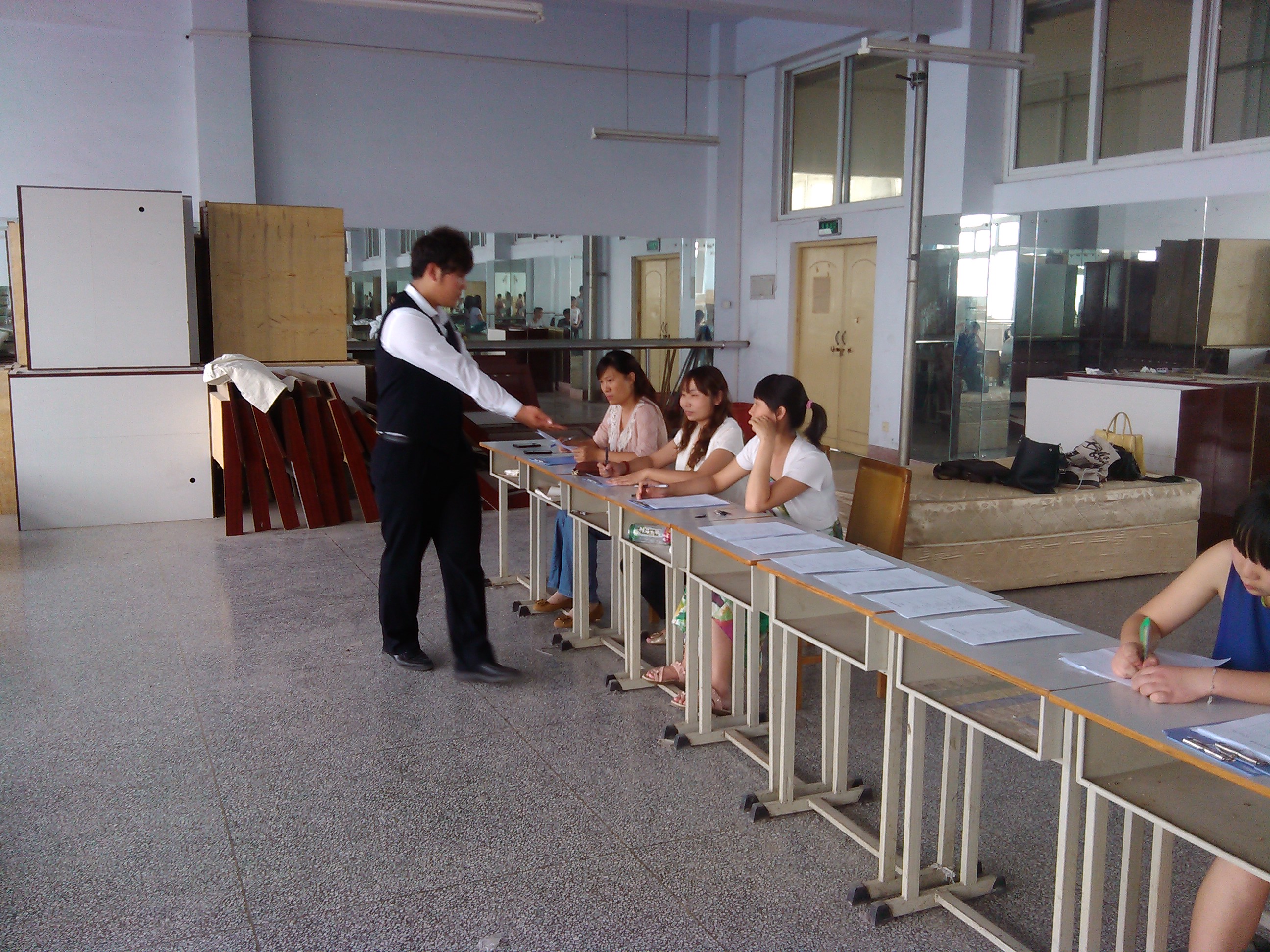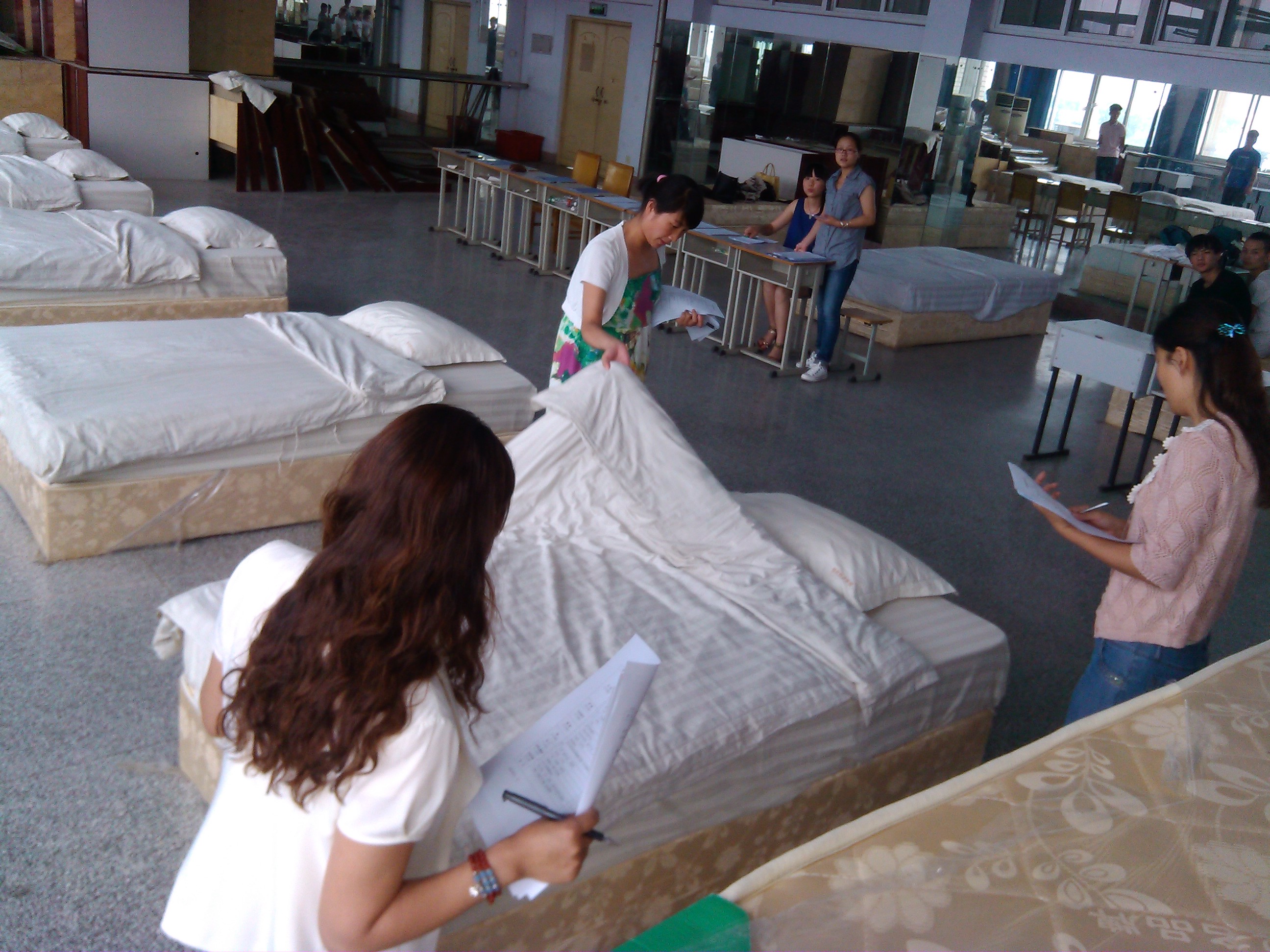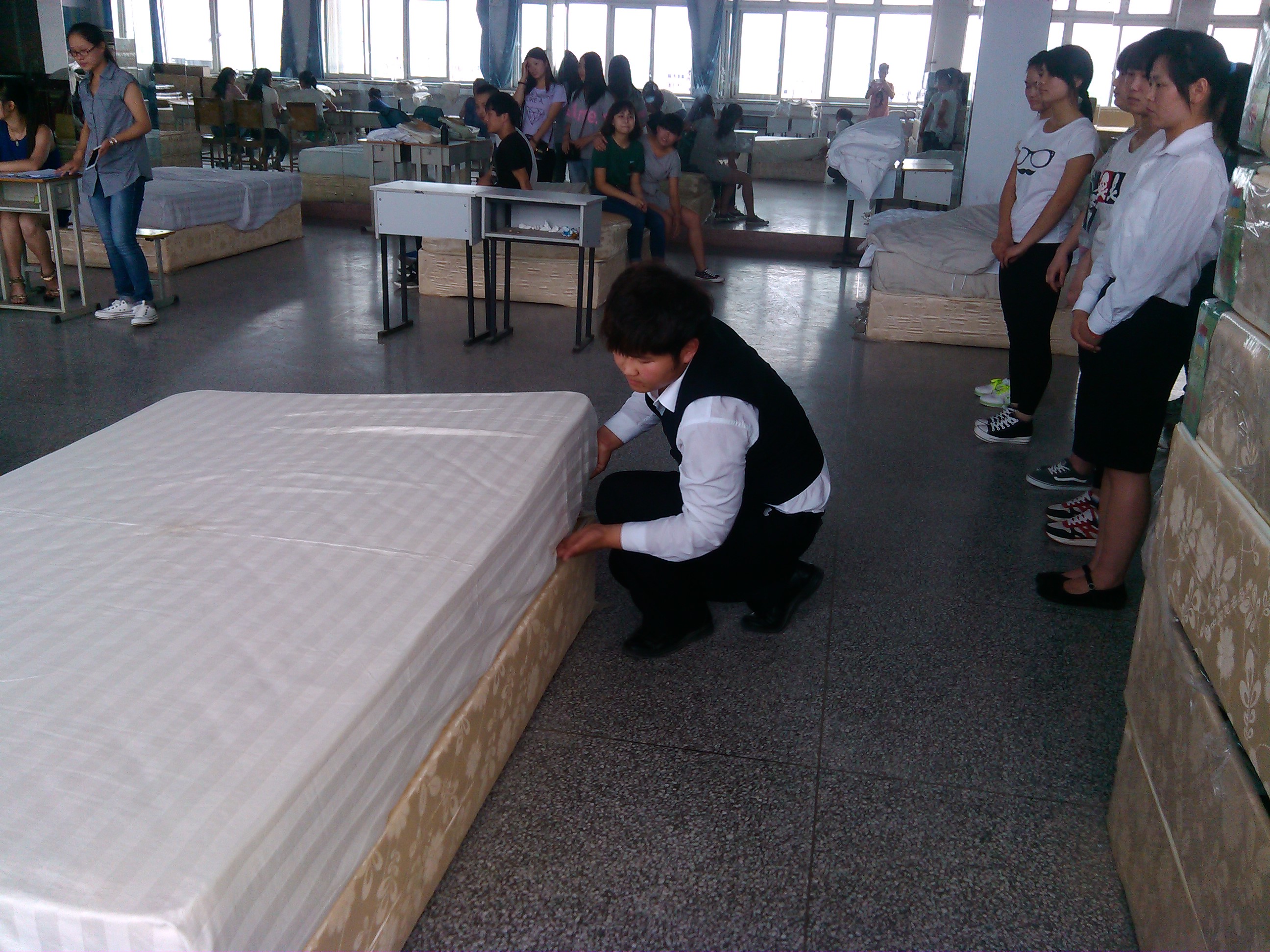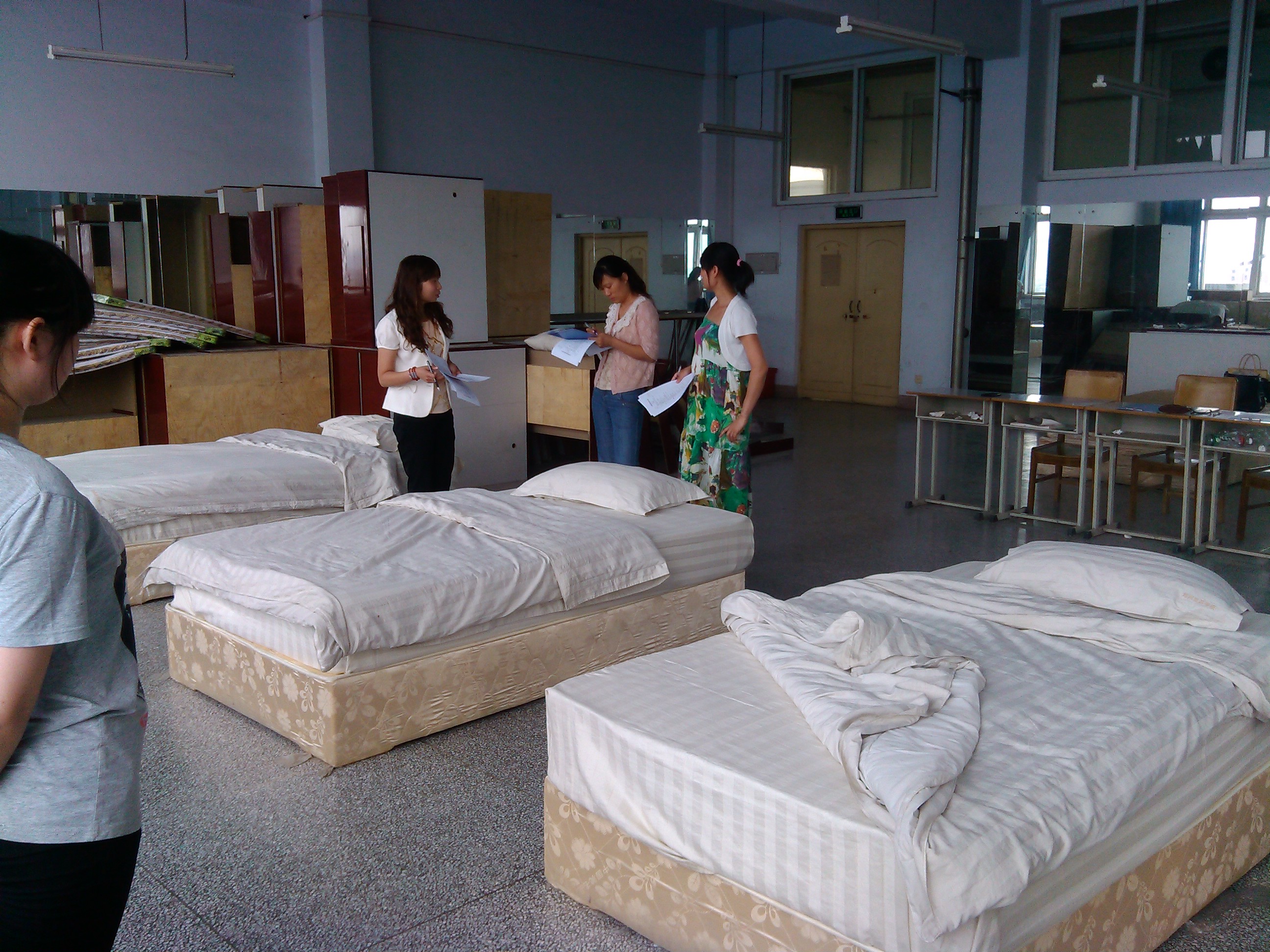 为了激发学生学习专业知识的兴趣,形成良好的专业氛围,2014年6月4日下午,酒店管理系在实训楼五楼客房实训室内成功举办了中式铺床技能大赛初赛。本次比赛由酒店管理系专业课老师周娟、李英、张利三位老师担任评委。