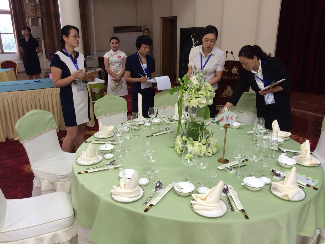 此次大赛分五组进行,分别是:中式铺床、中餐摆台、西餐摆台、鸡尾酒调制、英语口试。钱丽娟、李英等老师担任中式铺床评委;李俊、郑琪等老师担任中餐摆台评委;姚志刚、石磊等老师担任西餐摆台评委;陈海彬、孙凌云老师担任鸡尾酒调制评委;李盛江、李娟等老师担任英语组评委。