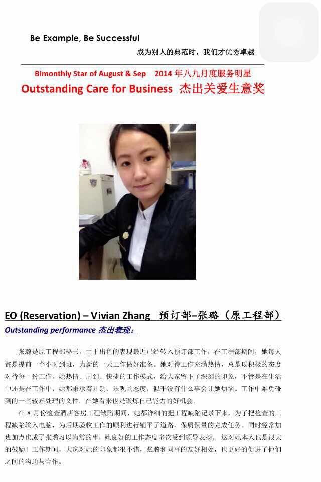 酒店管理系实习生张璐荣获宁波泛太平洋酒店双月度服务明星-杰出关爱生意奖