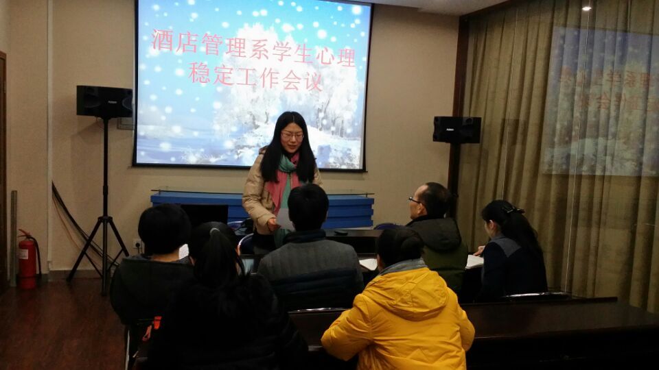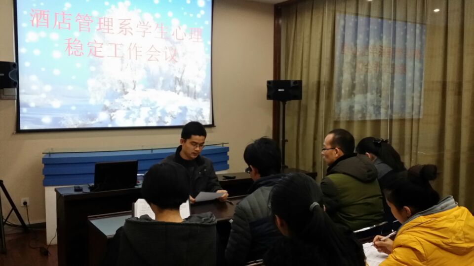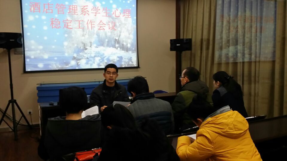 为了提高我系学生的心理健康素质,2015年1月20日中午,我系全体辅导员在实训楼三楼水晶客房召开期末学生心理稳定工作。主持本次动员会的是酒店管理系党总支副书记陈海彬,团总支书记马彦峰及全体辅导员参加了大会。