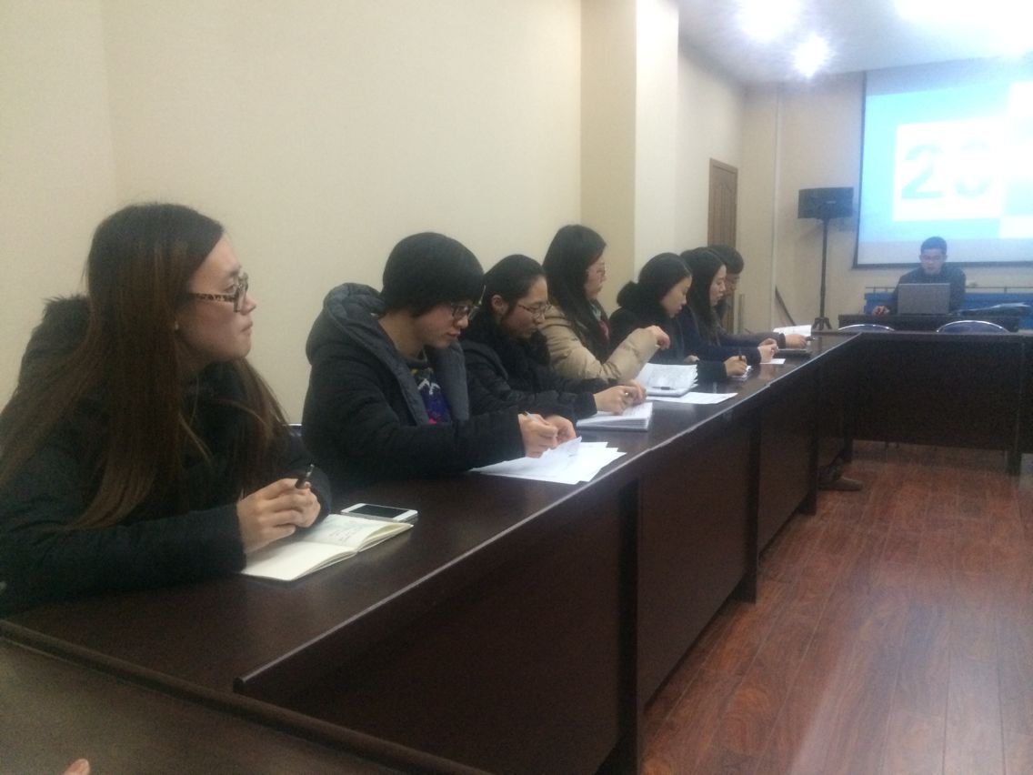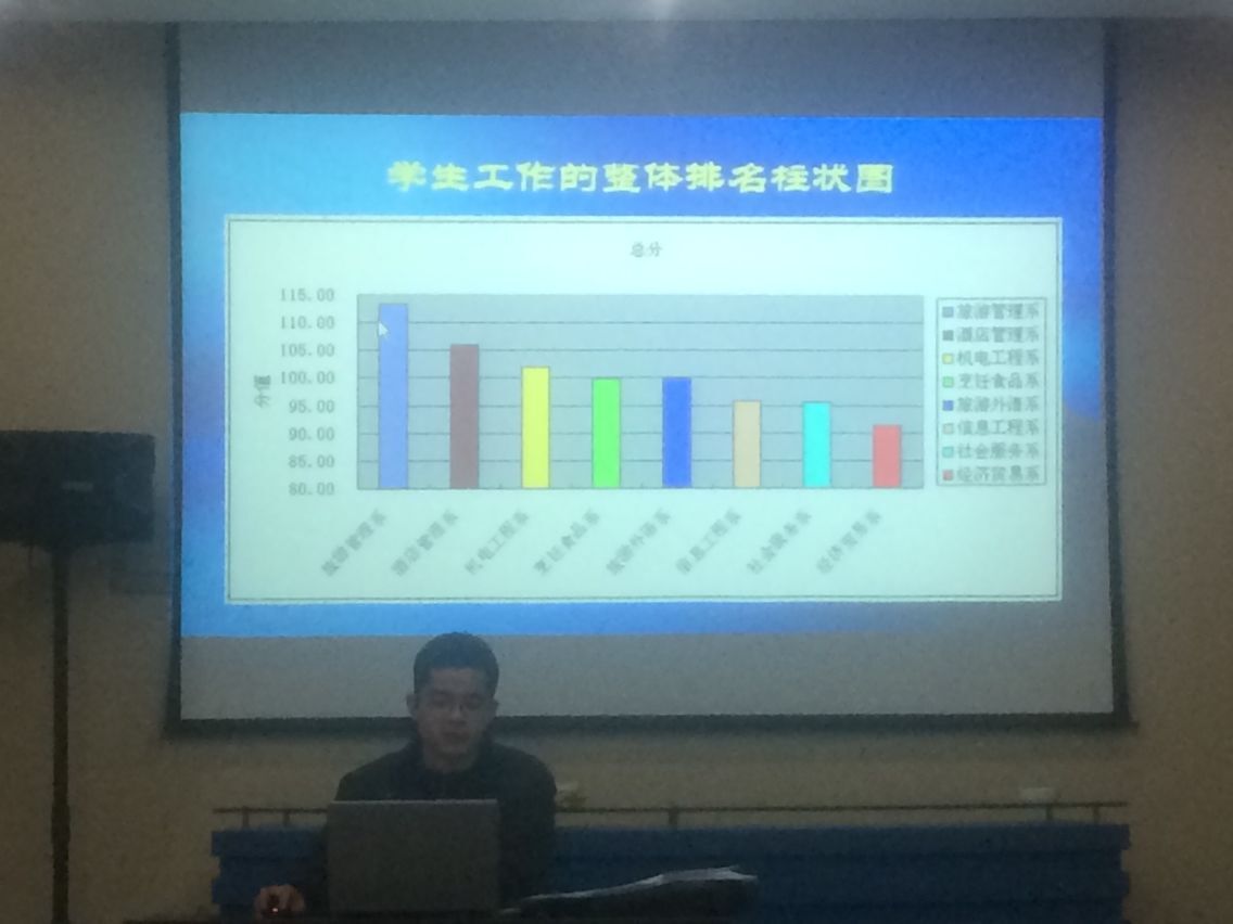 会议上,陈书记首先宣布在2014年系部学生工作取得了全院第二名的成绩,并对为此成绩付出努力的老师和同学们表达了感谢;随后,陈书记带着大家重新熟悉了系部考核的具体指标和酒管系的得失分情况。
