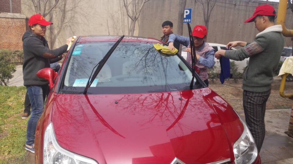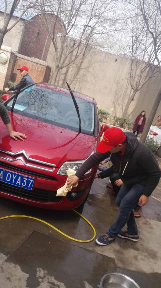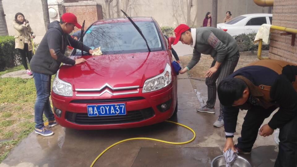 2015年3月16日上午,在酒店管理系青志部和社会实践部的联合组织下,酒店管理系学生志愿者们在操场西侧进行了半个小时的洗车活动。