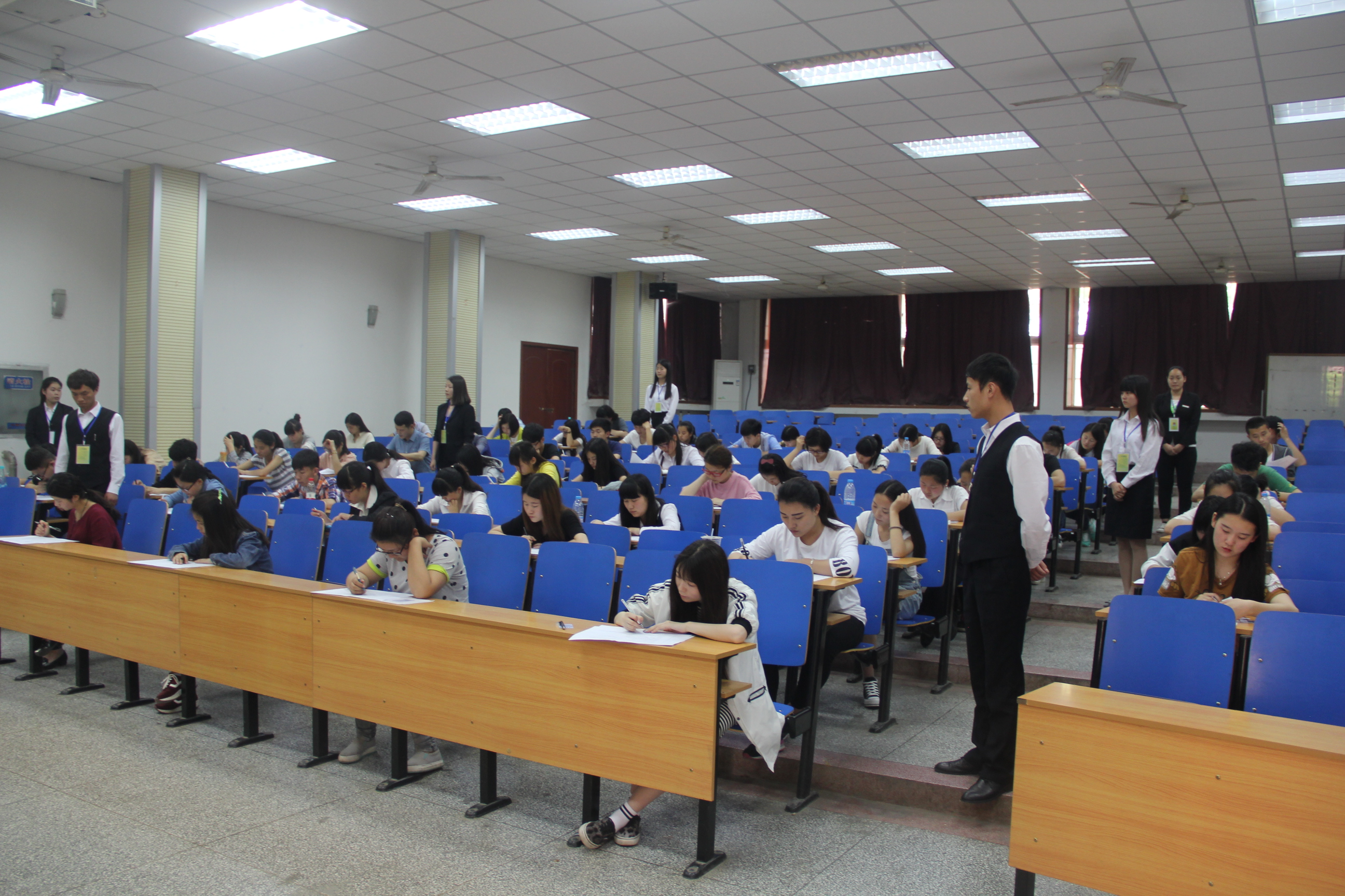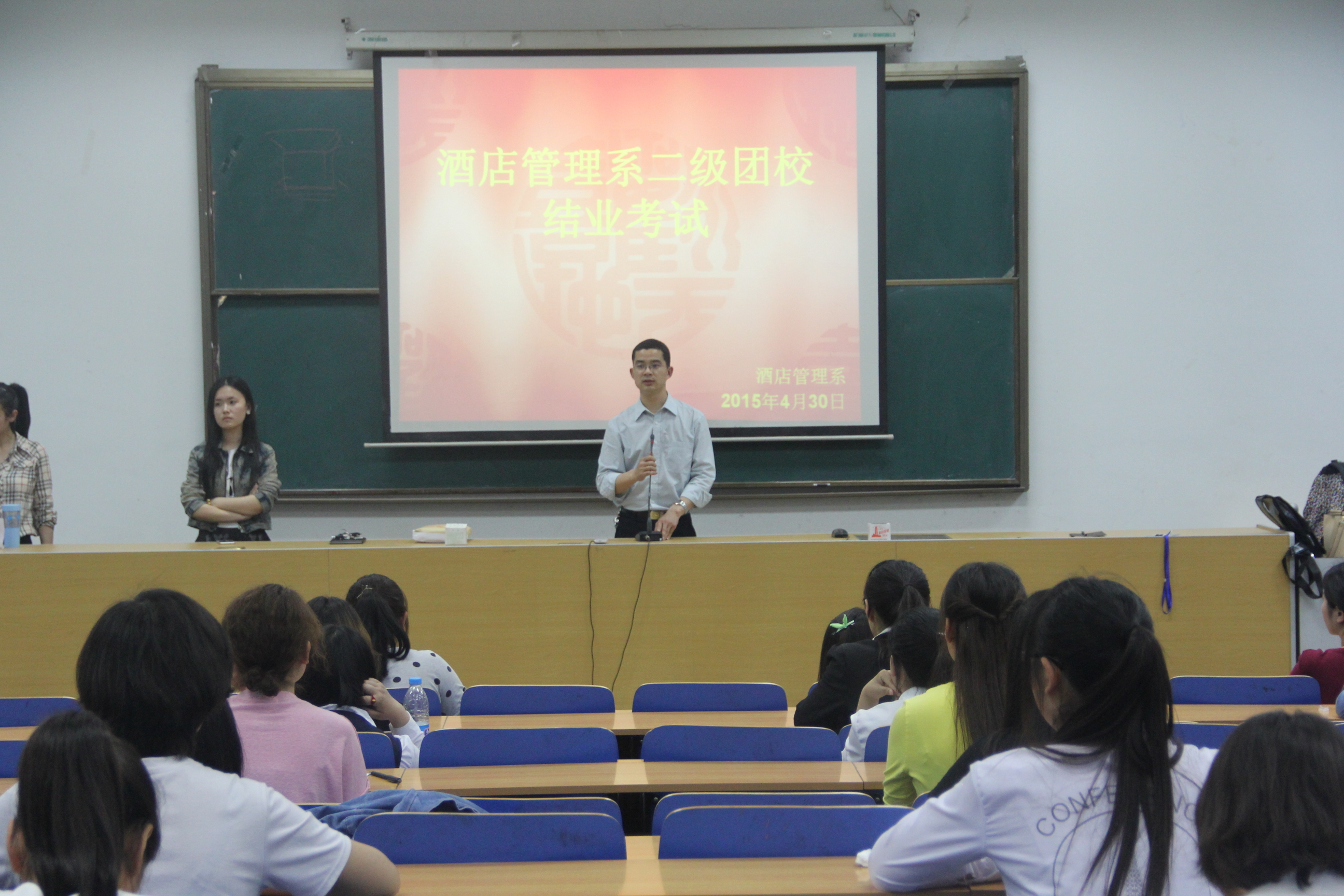 2015年4月30日中午,酒店管理系二级团校结业考试于实训楼一楼报告厅举行。本次考试的监考人员有院团委岳正阳老师、崔灵玲老师,酒店管理系陈海彬老师、曹靓老师和六名学生干部,酒店管理系二级团校学生参与了考试。