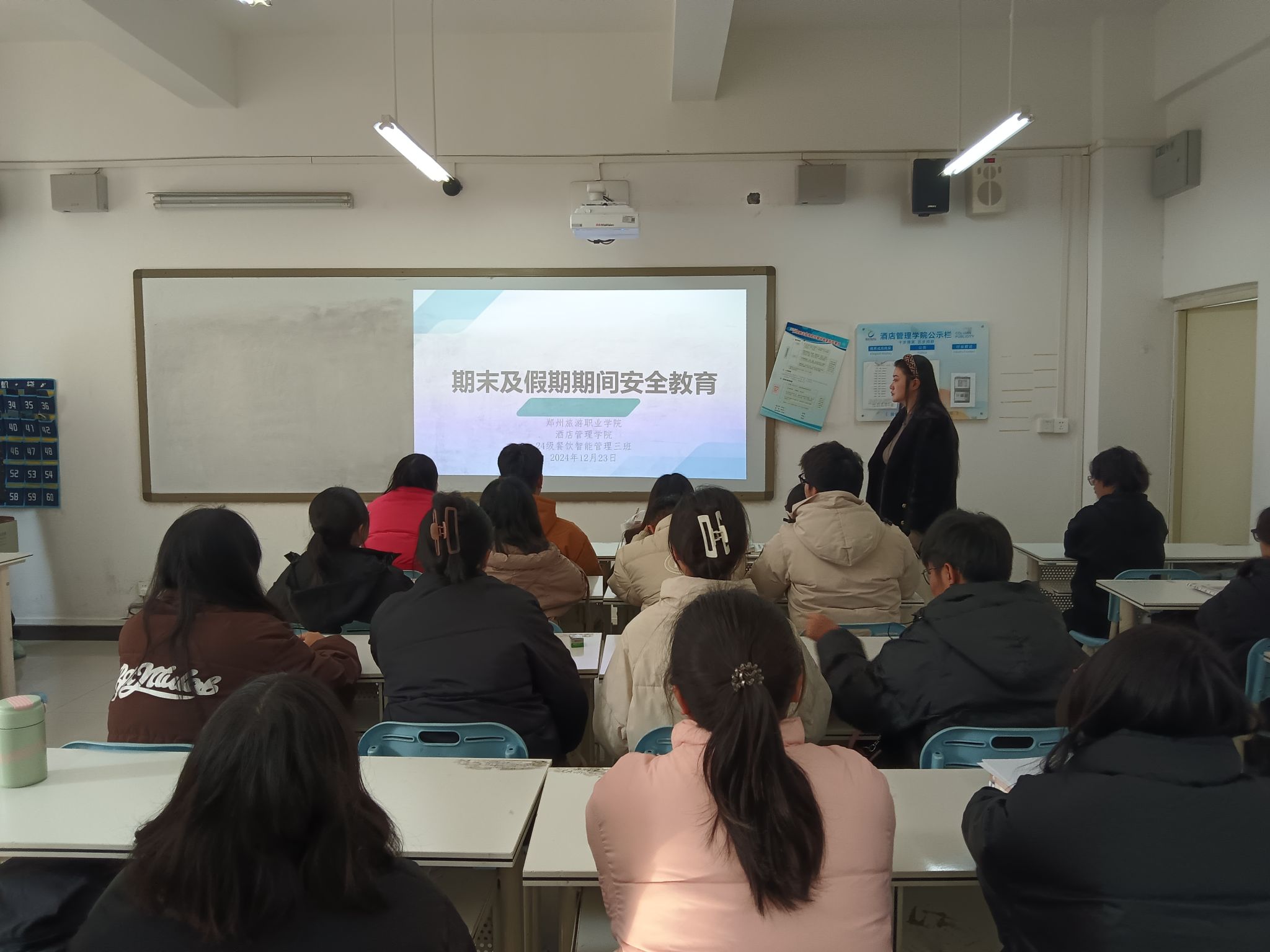 班会上,班主任围绕期末宿舍安全、离校路途安全、寒假期间安全三大主题,重点强调了消防安全、交通安全、网络安全、防诈防骗、线上线下非法集会、假期兼职、社会实践、烟花爆竹等安全内容,做到安全全覆盖。叮嘱同学们要牢固树立安全第一、预防为主的思想,在安全问题上不容半点麻痹和侥幸,生命最为宝贵,提高安全意识,增强自我保护,珍爱生命,确保自身安全,合理规划假期时间,做到学习、休息、娱乐三不误,过一个安全、健康、快乐、充实的寒假,平安春节,欢乐新年。