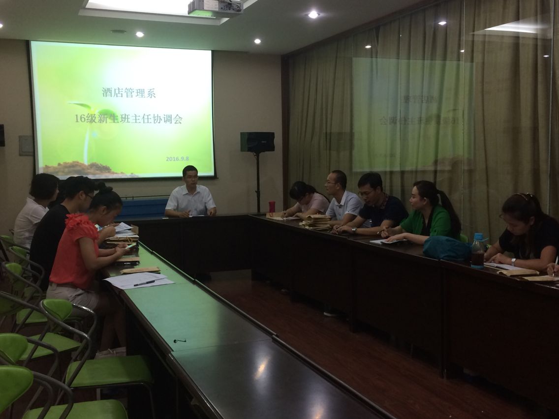 2016年9月7日下午,为了迎接2016级新生的到来,做好新学期的学生管理工作,酒店管理系党总支副书记陈海彬在实训楼中餐厅主持召开了新生班主任交流会。