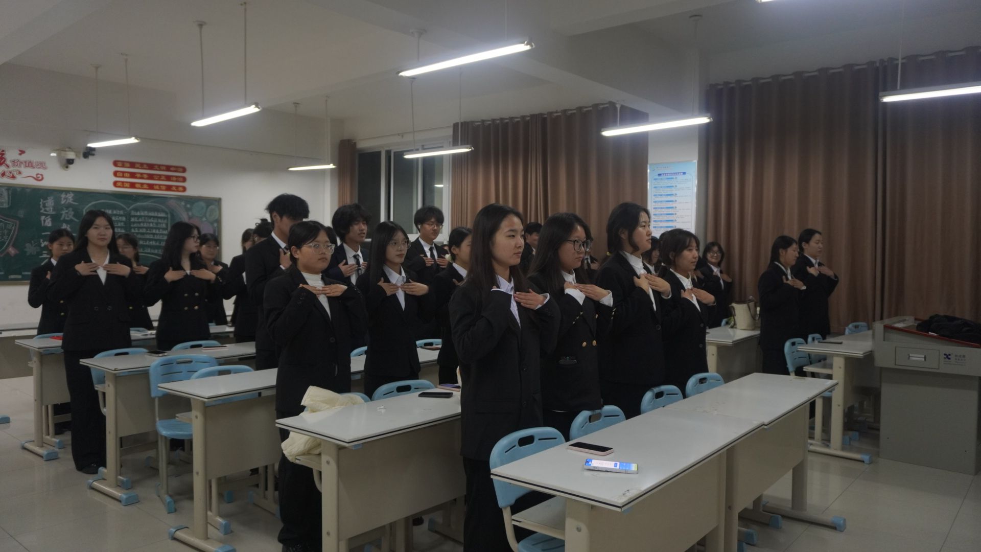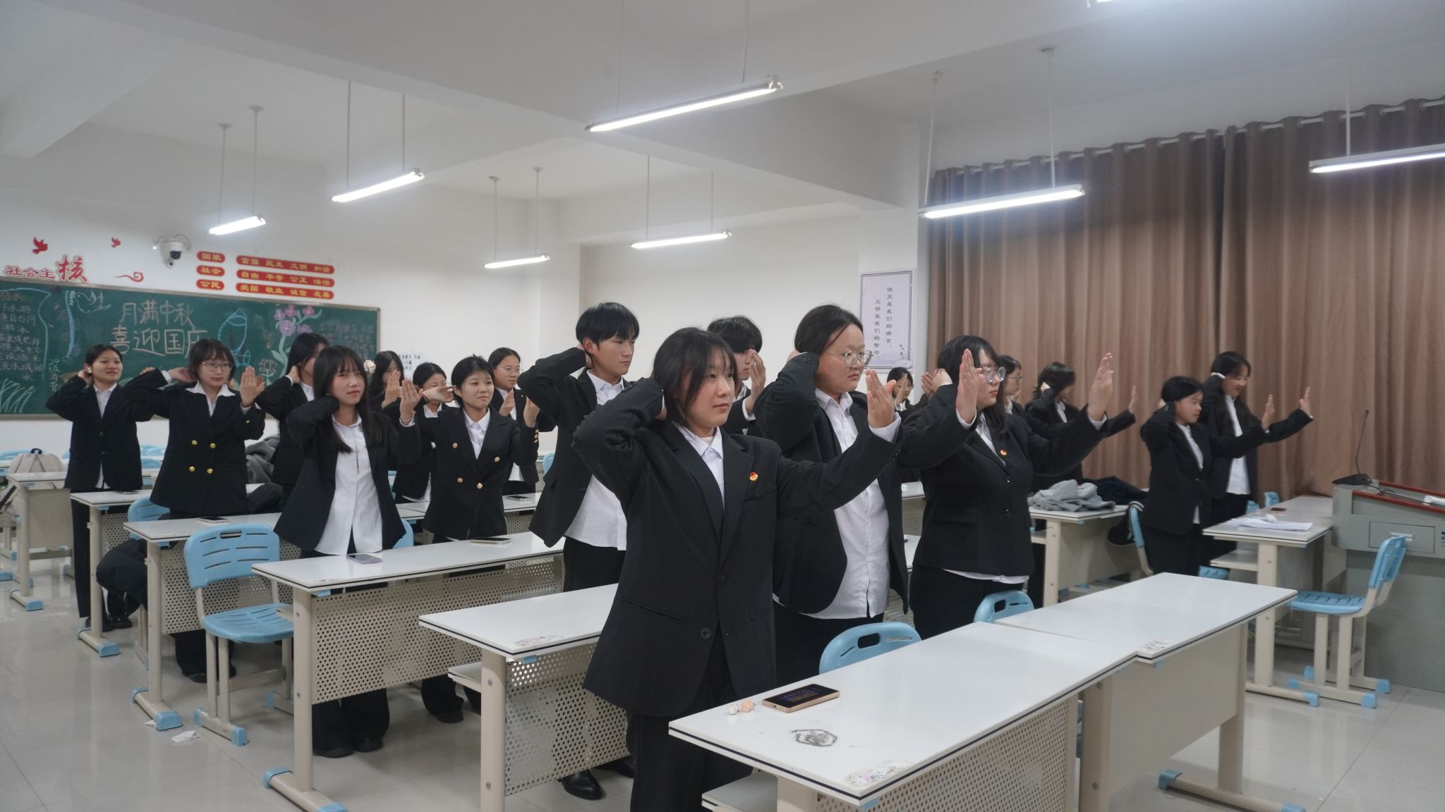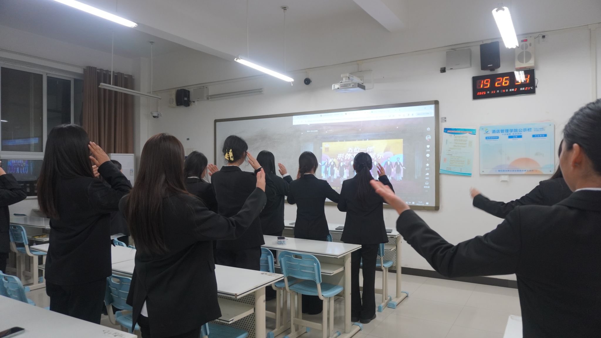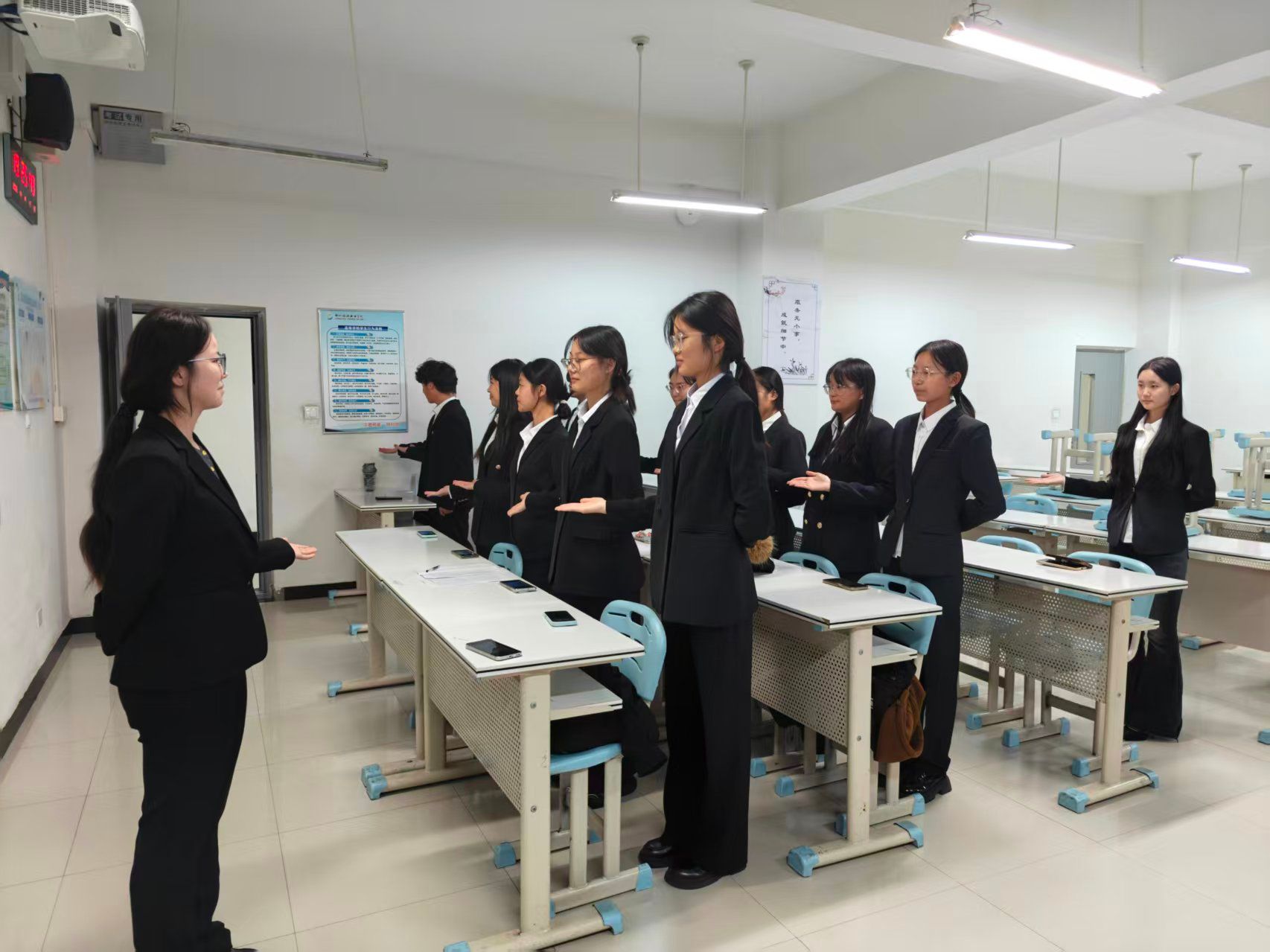 在排练过程中,各班紧扣酒店服务核心岗位需求,将前厅接待指引、宴会服务站姿等专业礼仪技能,转化为抬手、转身、微笑等标准化礼仪操动作,兼顾专业性与实操性。排练前,同学们集中观看文明礼仪操示范视频,逐节拆解“手势角度、微笑弧度、步伐节奏”等要领,明确动作标准与要求。排练时,同学们反复打磨动作协调性与整齐度,相互纠正手势不到位、节奏不统一等问题。大家分工协作,班级内形成“互帮互促、比学赶超”的欢乐氛围。