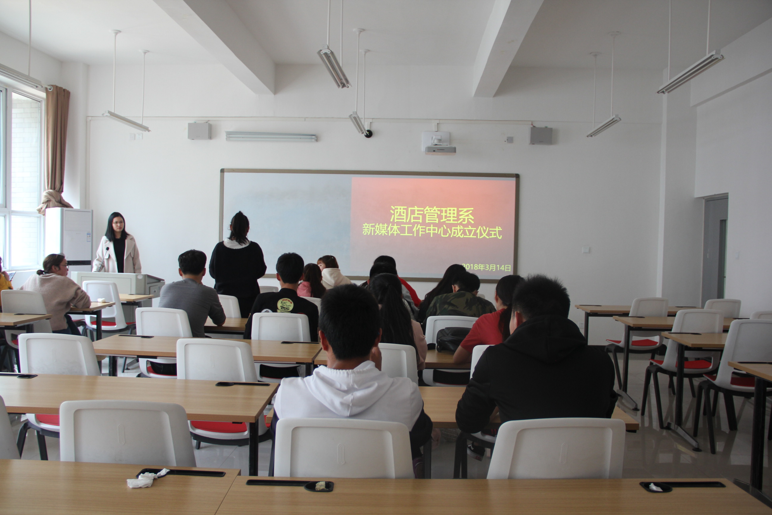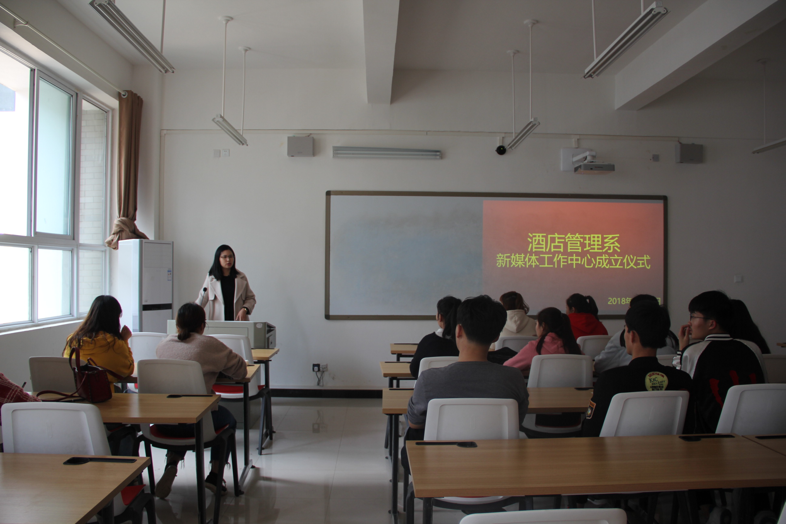为切实做好我系宣传工作,积极主动行使宣传职能,畅通信息沟通渠道,维系师生情感纽带,营造正能量舆论氛围,按照李主任和陈书记的指示部署,2018年3月14日,酒店管理系新媒体工作中心正式成立。酒管系新媒体中心以新时代、新青年、新视角为宗旨,充分发挥组织特性,以微信公众号、系部网站、新浪微博、贴吧等网络平台对院系组织的各项活动、校园新闻、动态信息进行宣传和报道,同时利用新媒体开展一系列创新活动,以此增加校园文化内涵,丰富校园生活。