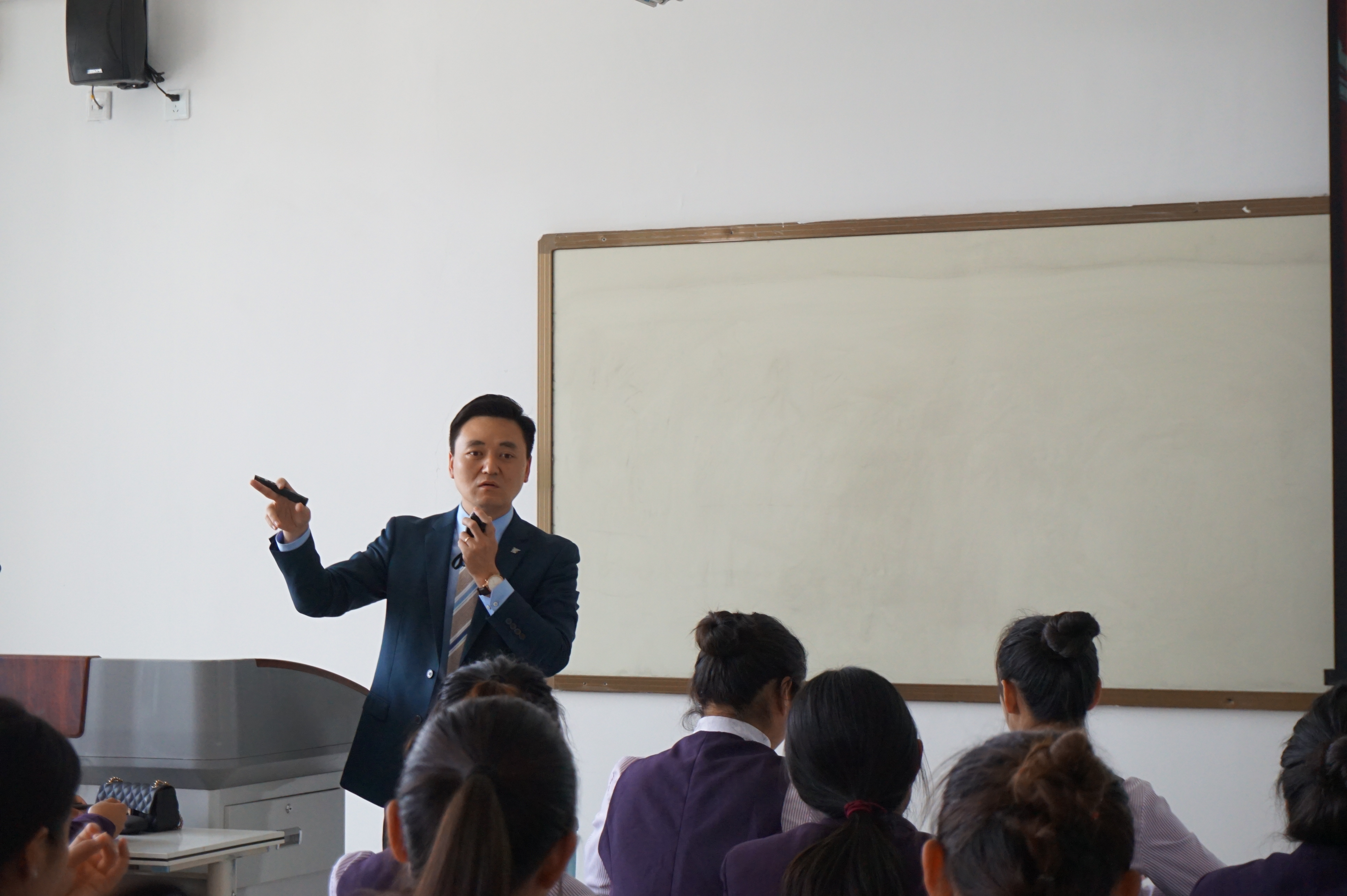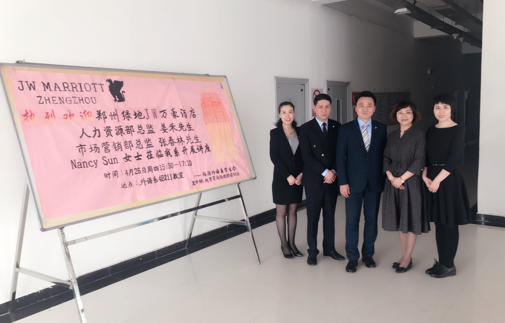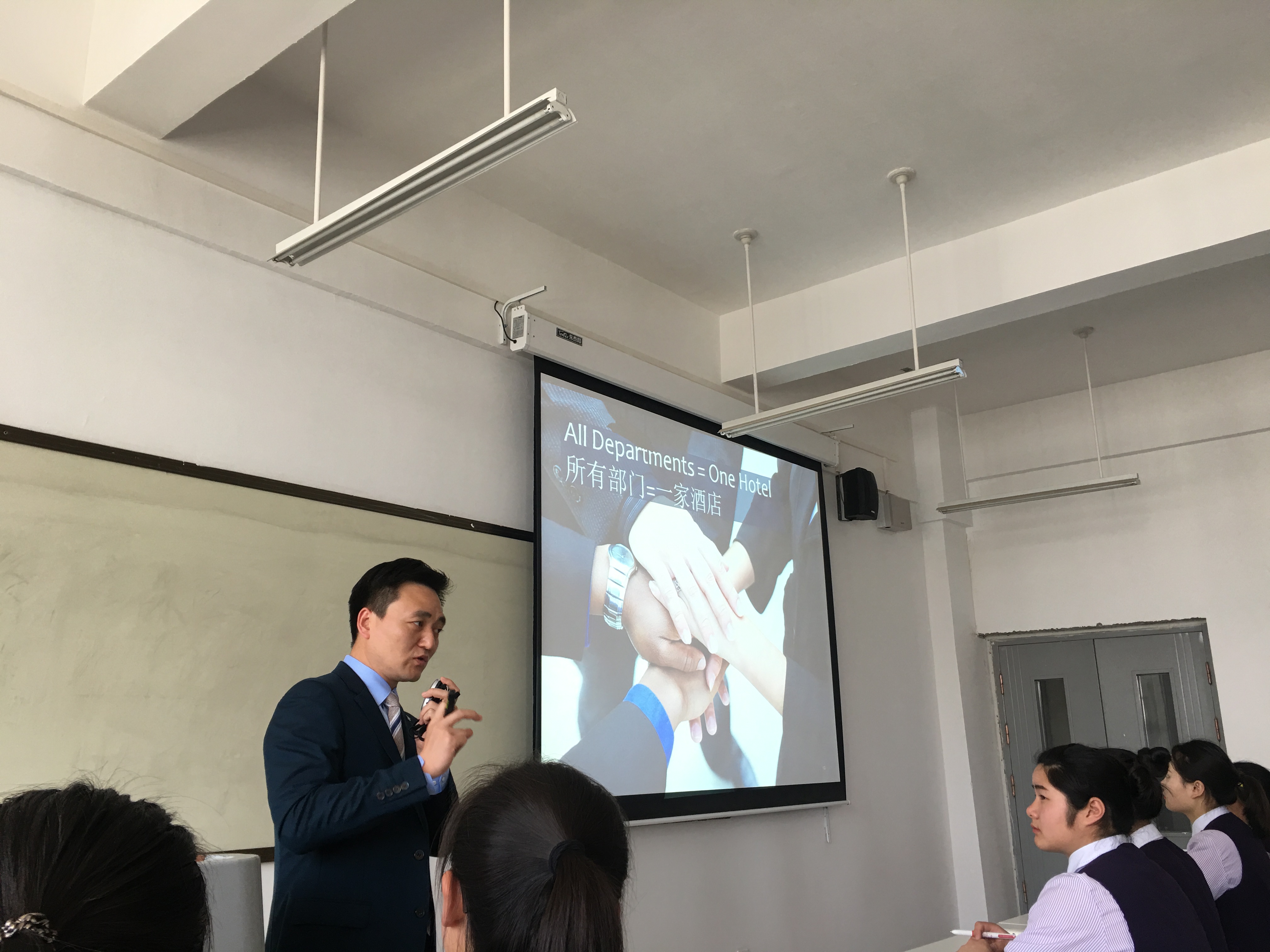 首先郑州绿地JW万豪人力资源总监姜禾先生为参与讲座的同学们讲解了万豪集团的发展史,并和大家分享了自己的工作经验,让同学们了解到职业酒店人的标准,又向大家介绍了非常实用的实习生工作技能,而后姜先生着重讲解了英语学习的重要性,告诉同学们酒店行业对英语的要求非常高,希望同学们在校期间好好学习英语,为日后走上工作岗位打下良好基础。