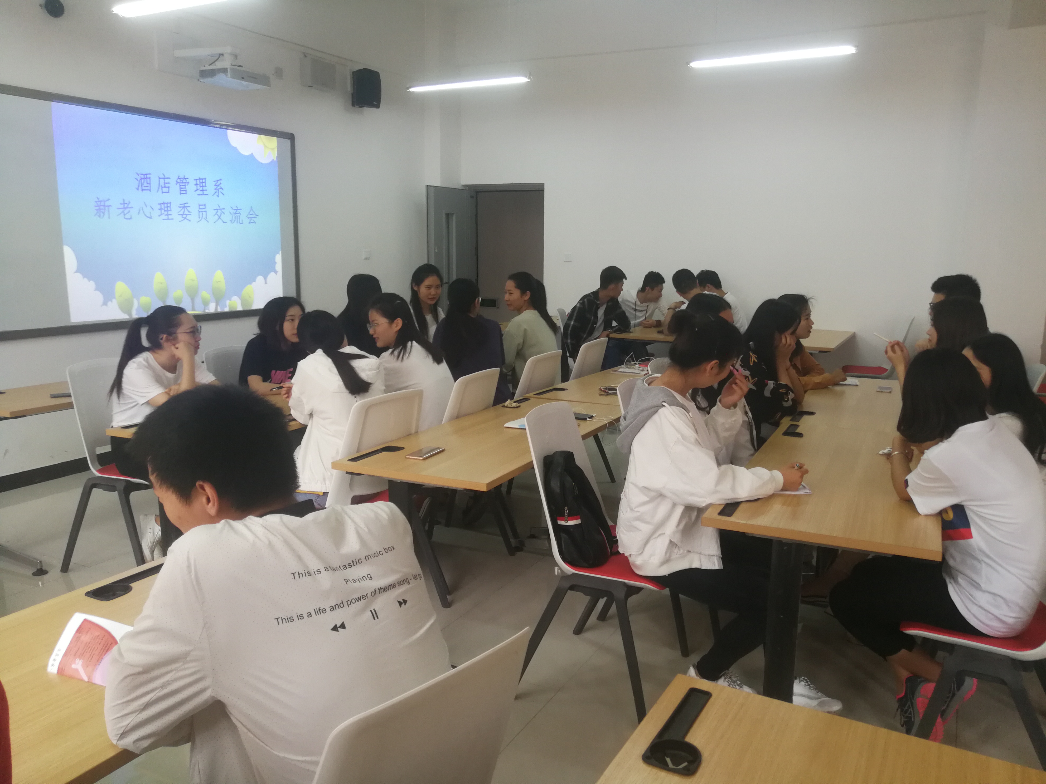 2018年5月24日,酒店管理系孙颜老师与酒管系心教部干事于2A305教室组织我系16级、17级心理委员进行了此次心里培训第五讲——新老心理委员交流。活动开始前因为大家都不太熟悉,所以为了打破尴尬孙颜老师用诙谐幽默的讲解向大家解释并说明了新老心理委员交流对于接下来一年里学生心理健康的意义及重要性。而后16级17级心理委员就孙颜老师讲解时提出的问题做出了激烈的讨论,心理委员们在讨论中就所提问题孙老师一一解决。在本次交流中大家对一些新的学生心理问题作出了讨论并寻找解决办法。16级的学姐学长们还为以后系部心理工作以及17级的学弟学妹们提出了很多宝贵的建议,同时也收到了学弟学妹们给予的结业祝福。