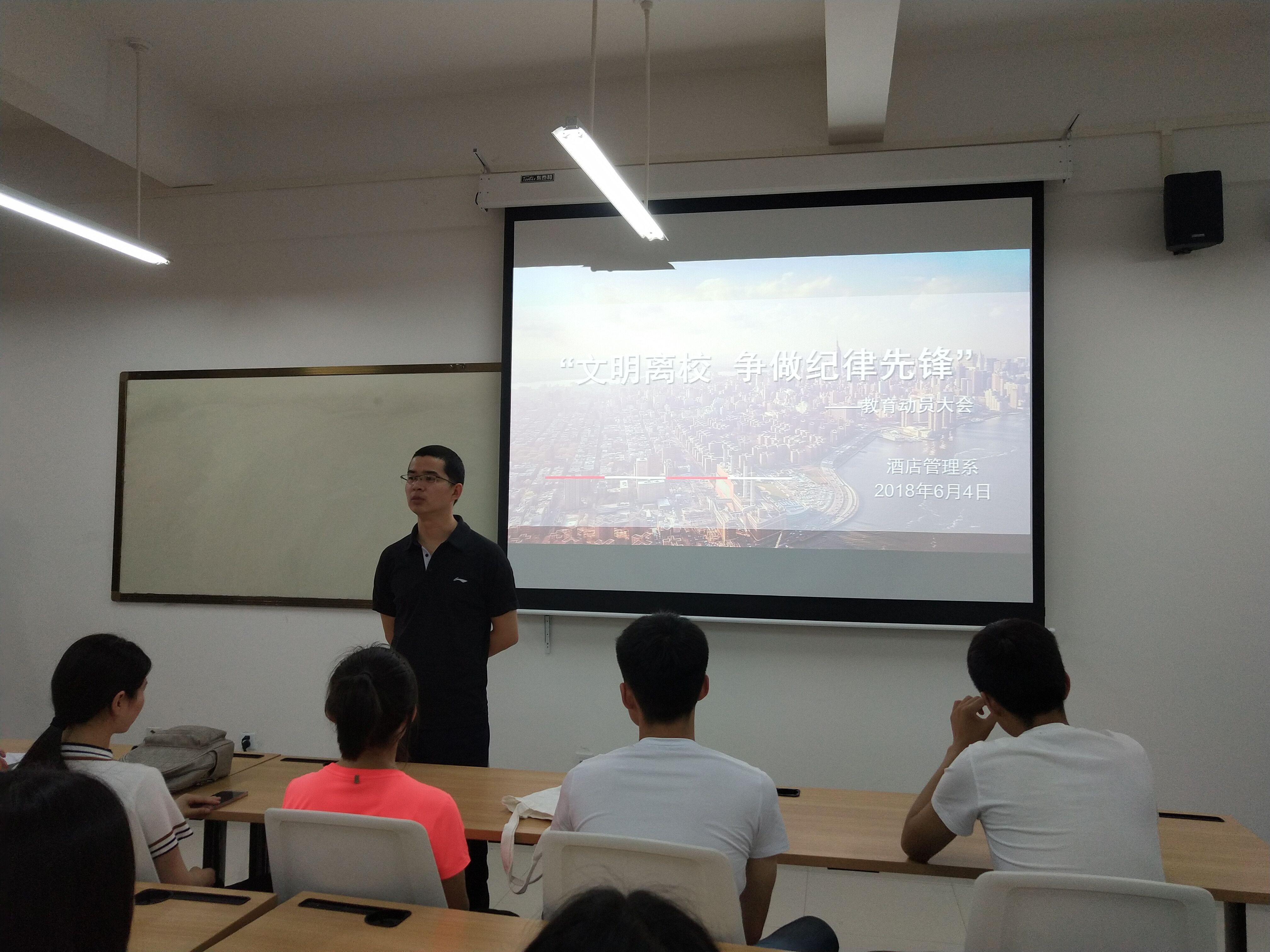 会上,陈书记首先向2016级学生代表即将奔赴心仪的酒店实习表示祝贺;接着,肯定了他们近两年来对系部工作的支持和奉献;随后,根据近期2016级实习生在校表现,再次强调了学校及系部的纪律要求;最后,希望学团干部和班委站好最后一班岗,争做文明离校的榜样,争做纪律的先锋。