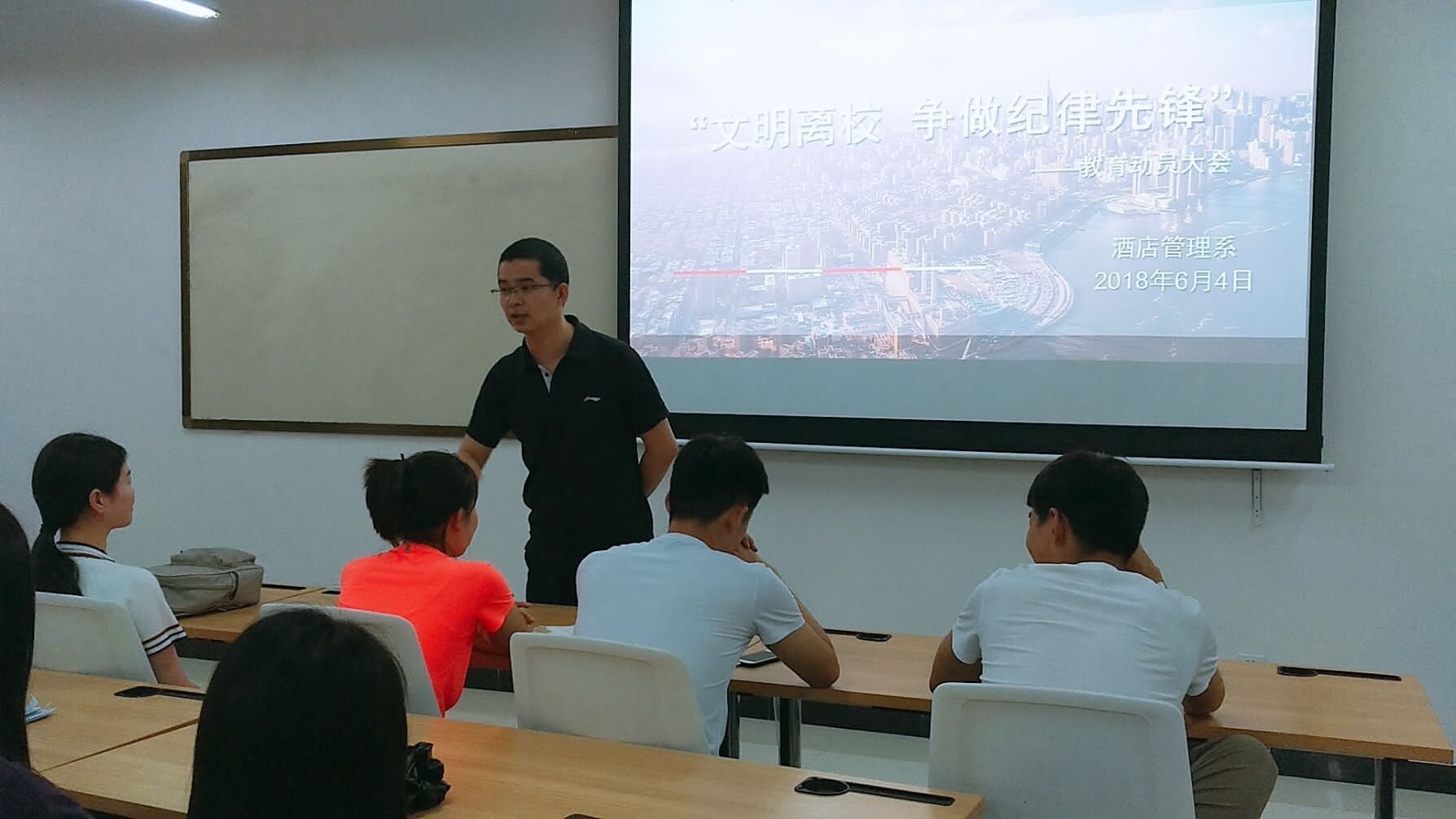 6月4日下午四点,我系在2号教学楼B区302教室召开“文明离校,争做纪律先锋”动员大会。参加本次大会的领导老师有陈海彬副书记和全体辅导员,学生代表有2016级学团干部、各班班委及宿舍长。