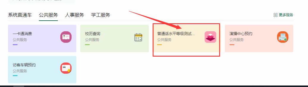 3) 在系统直通车卡片中找到普通话水平测试报名服务,点击进入