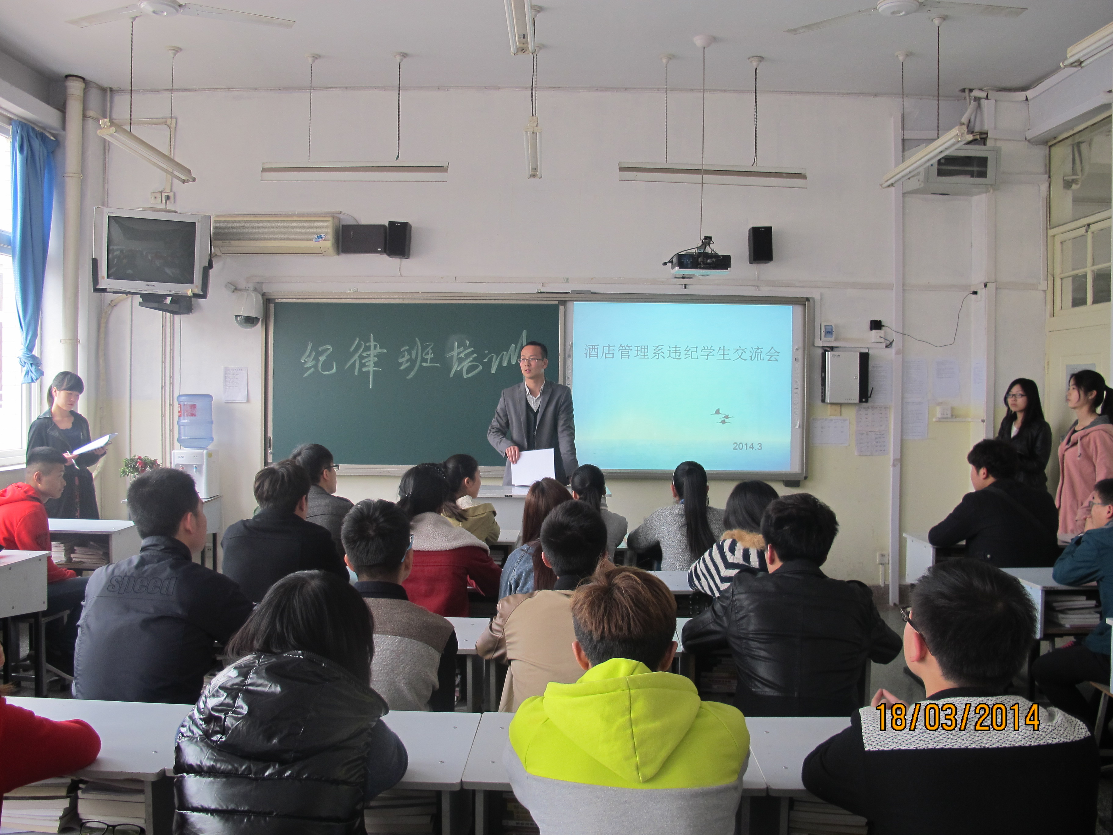 为了使违纪学生明确处分单的害处及如何撤销处分。2014年3月19日下午,孙孟珂老师于东教学楼312教室召开了“违纪学生交流会”。酒店管理系全体违纪处分学生参加此次会议。