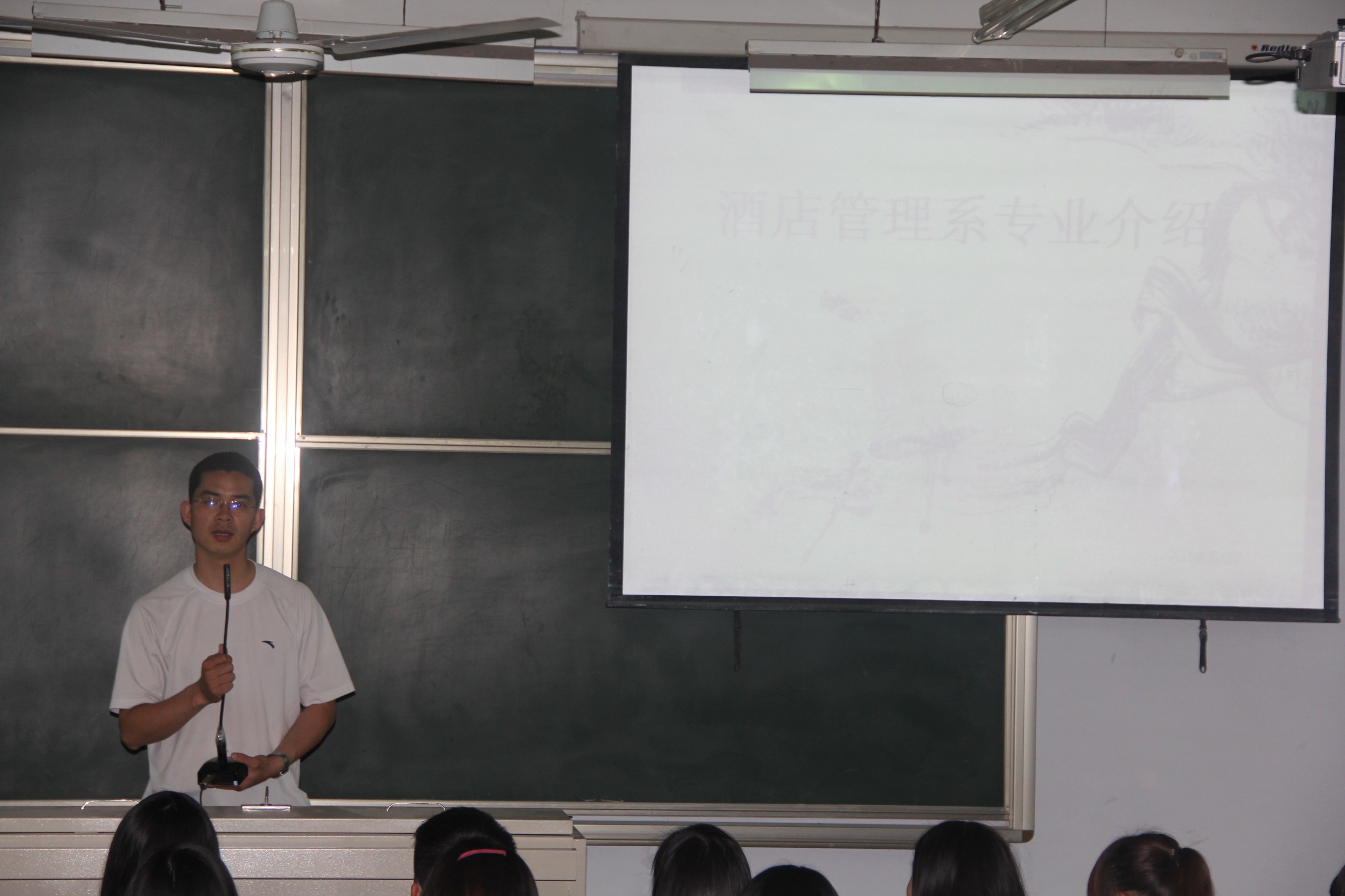 酒店管理系主要由酒店管理、餐饮管理、营销、财会以及游轮服务几个专业组成,会议中,陈海彬老师从培养目标、就业前景、学生毕业应获专业证书、课程设置、专业名师、专业实训室、实习基地、比赛成果等方面向同学们分别介绍了这些专业,不时引用一些有趣的事例,语言幽默,让同学们听的津津有味。