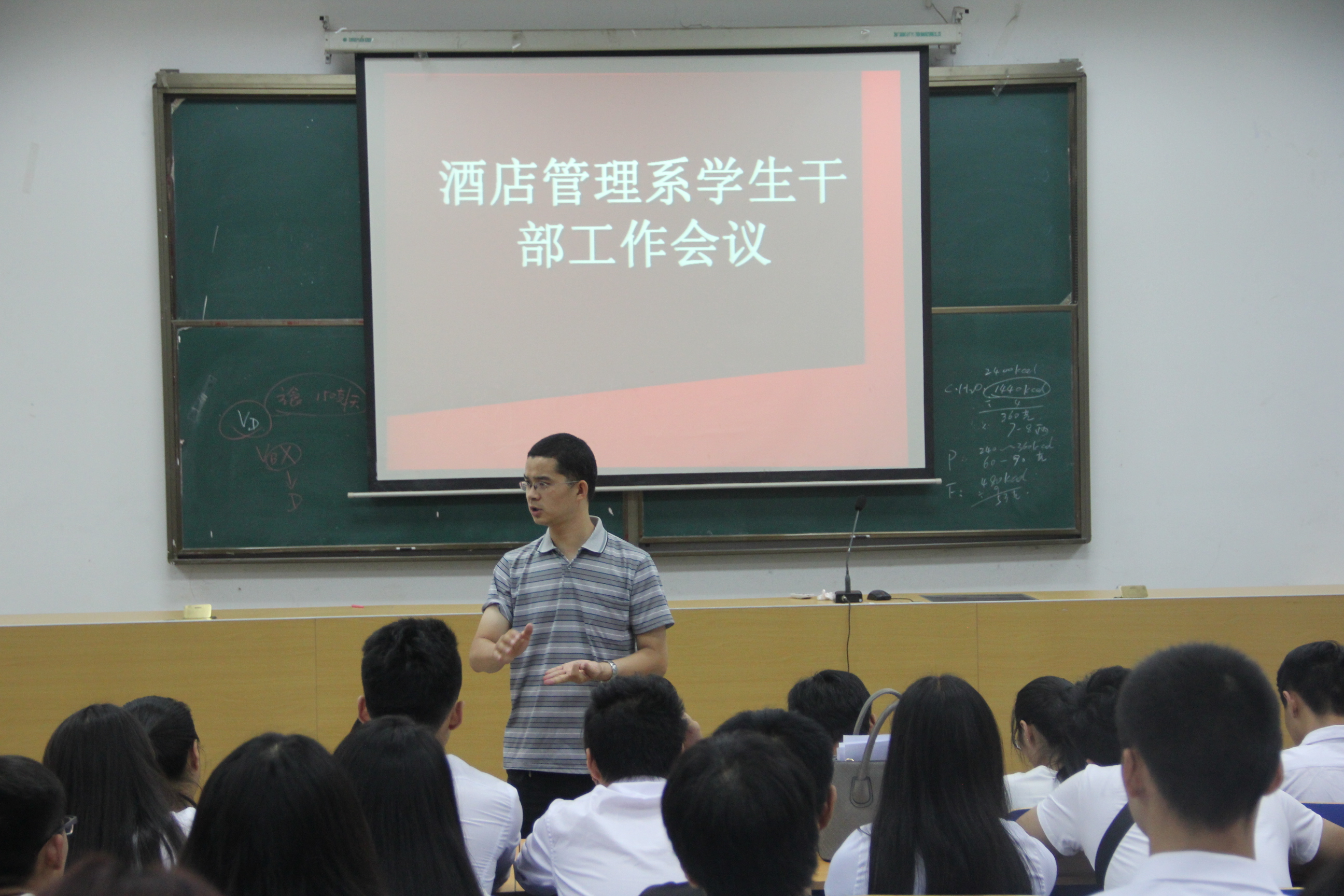 2015年9月7日下午,酒店管理系于实训楼一楼报告厅召开了学生干部会议。酒店管理系党总支副书记陈海彬、团总支书记侯宁波、全体辅导员以及全体学生干部出席了本次会议。