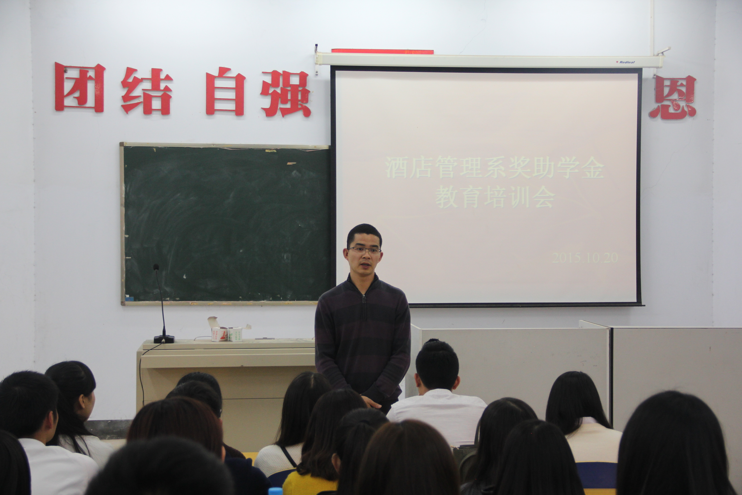 2015年10月20日16时,酒店管理系在校史馆一楼报告厅召开了奖助学金教育培训大会。出席本次会议的有酒店管理系党总支副书记陈海彬、团总支书记侯宁波以及辅导员高静。酒店管理系奖助学金待评定者参与了此次会议。