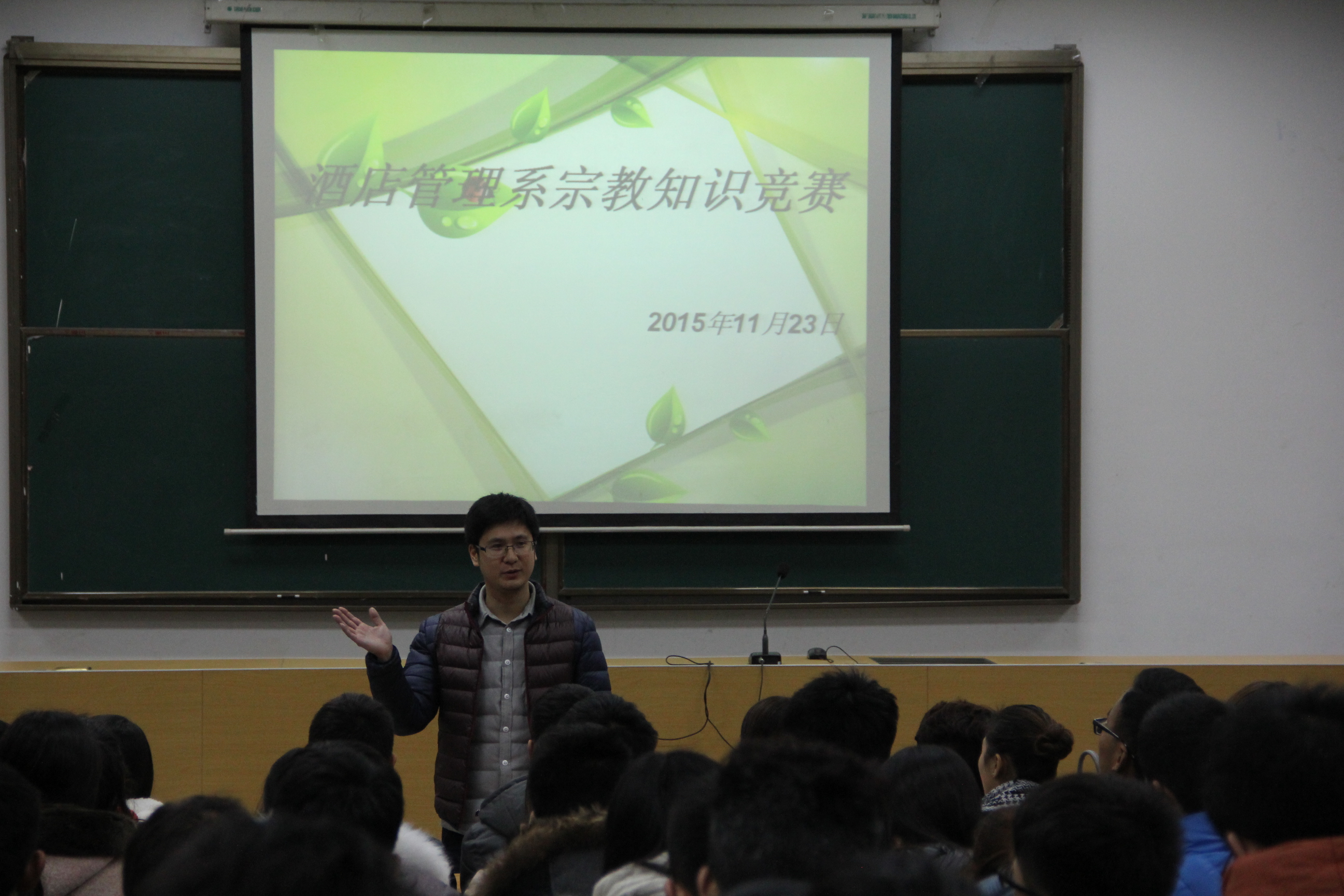 为深入贯彻党的十八大精神,推动普及宗教知识,宣传国家有关法律法规,2015年11月23日5点,酒管系宗教知识竞赛在实训楼一楼报告厅如期举行。酒管系书记侯宁波、各班辅导员及学生会全体干部出席参加了此次竞赛。