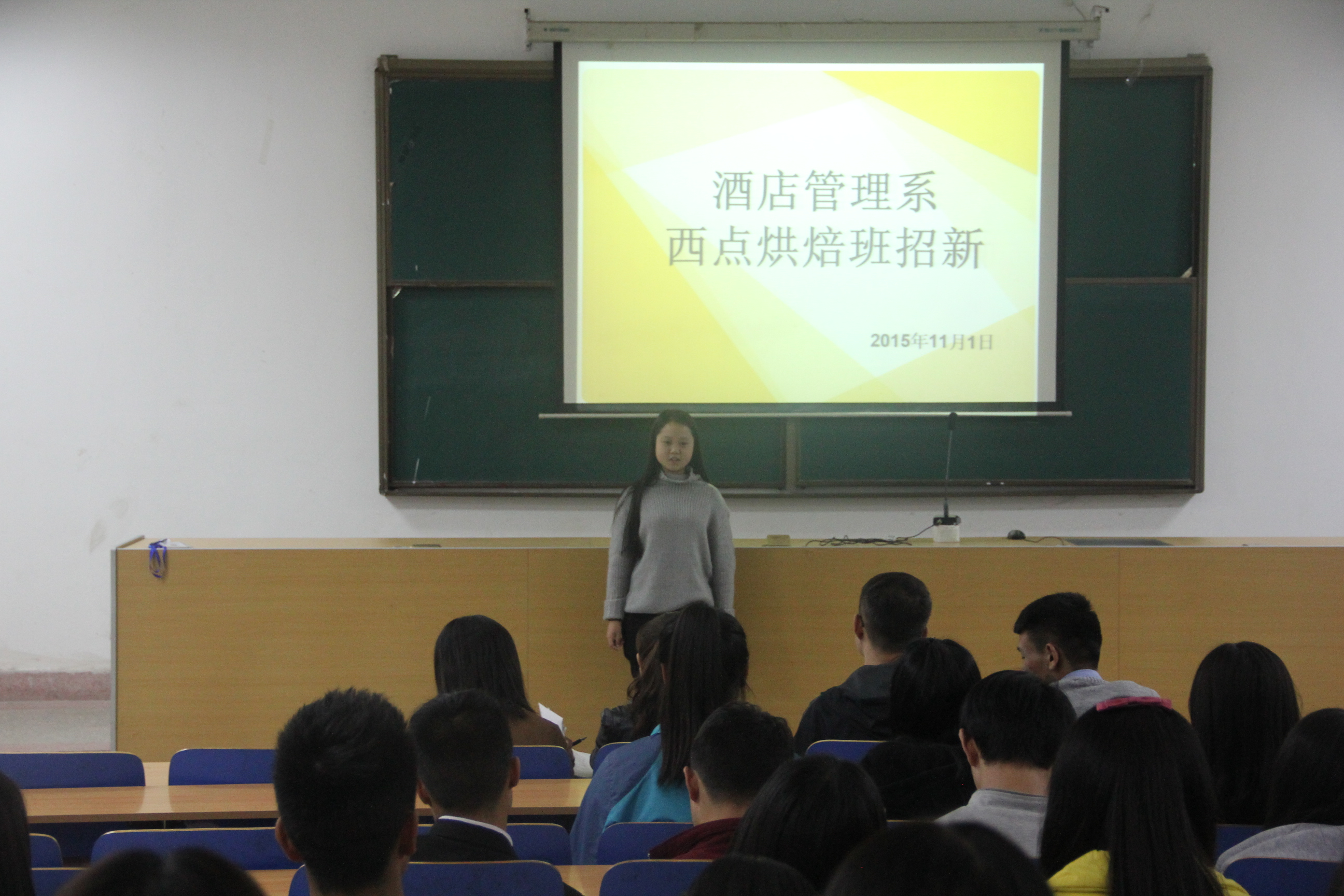 2015年11月1日19时,酒店管理系西点烘焙班招新初试在实训楼一楼报告厅进行,此次招新工作由酒管系学生书记户梅主持,2015级新生踊跃报名参与面试。
