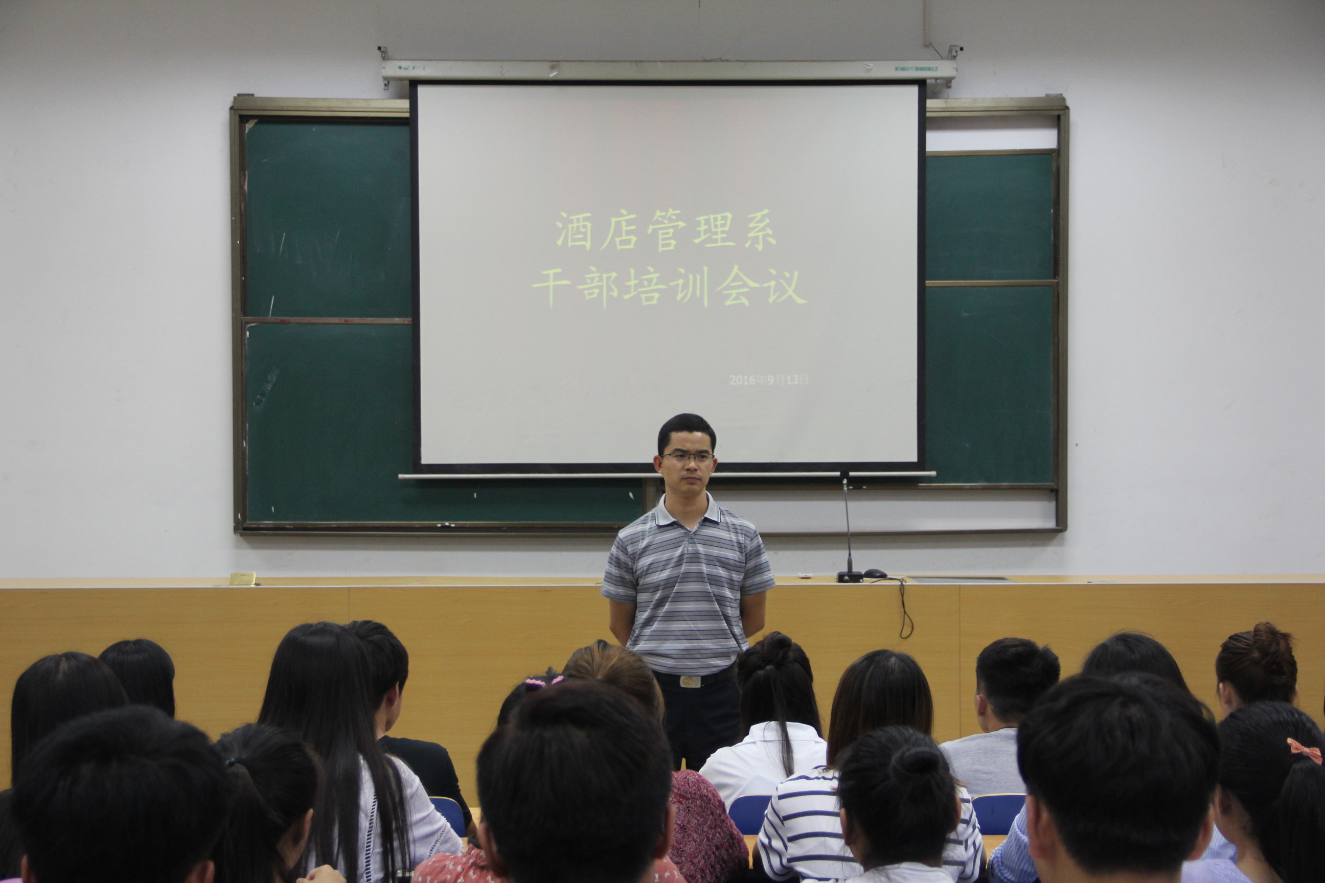 2016年9月13日下午,酒店管理系新学期干部培训会议在实训楼一楼报告厅召开,参加此次大会的有酒店管理系党总支副书记陈海彬以及全体优秀学生干部。