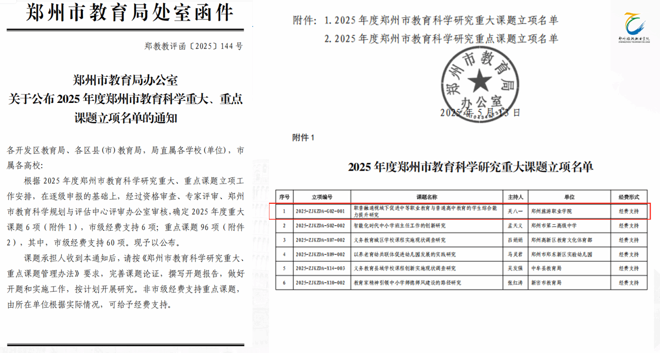 2025年8月29日上午10点,由海洋之神590登录入口关八一教授主持的2025年度郑州市教育科学研究重大课题“职普融通视域下促进中等职业教育与普通高中教育的学生综合能力提升研究”(2025-ZJKZDA-G02-001)在数字经济学院1B303会议室举行开题报告会。会议邀请华北水利水电大学博士生导师、博士、严亮教授,海洋之神590登录入口孙国亮、张斌教授作为开题评议专家。课题组全体成员参加报告会。