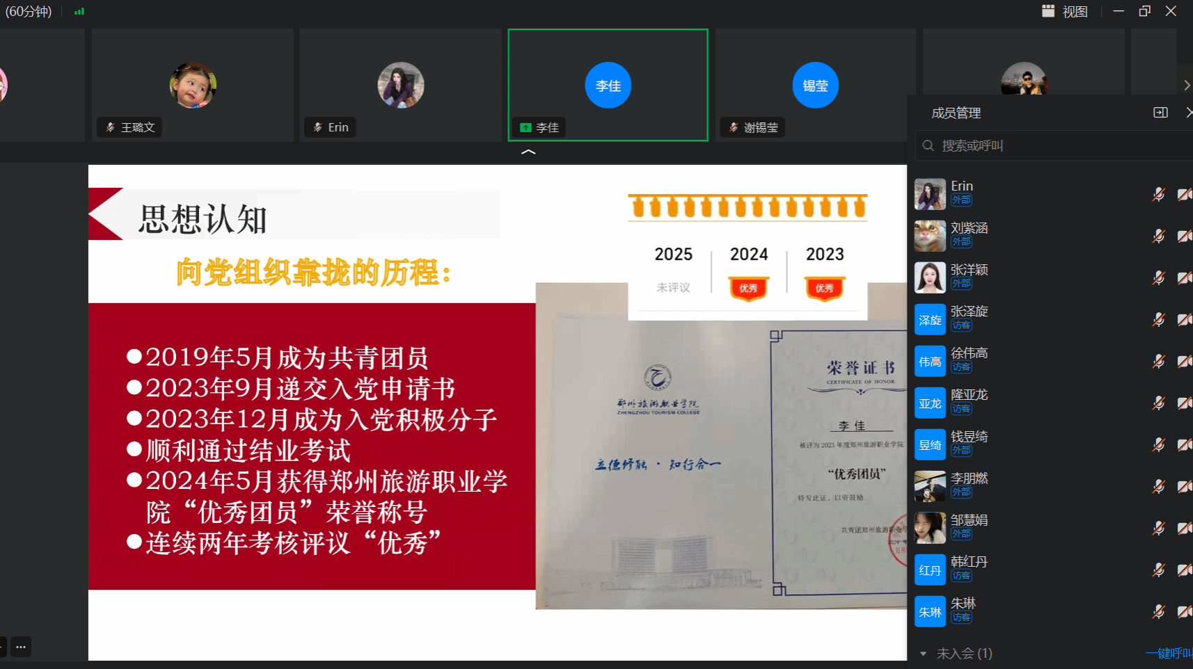 孙一娟等14名入党积极分子依次从自己在培养考察期间的政治思想、学习表现、实践活动等方面及需向党组织说明的其他问题做出详细汇报。随后,入党介绍人详细介绍了各位同志在培养考察期间的表现情况,并提出培养介绍意见。